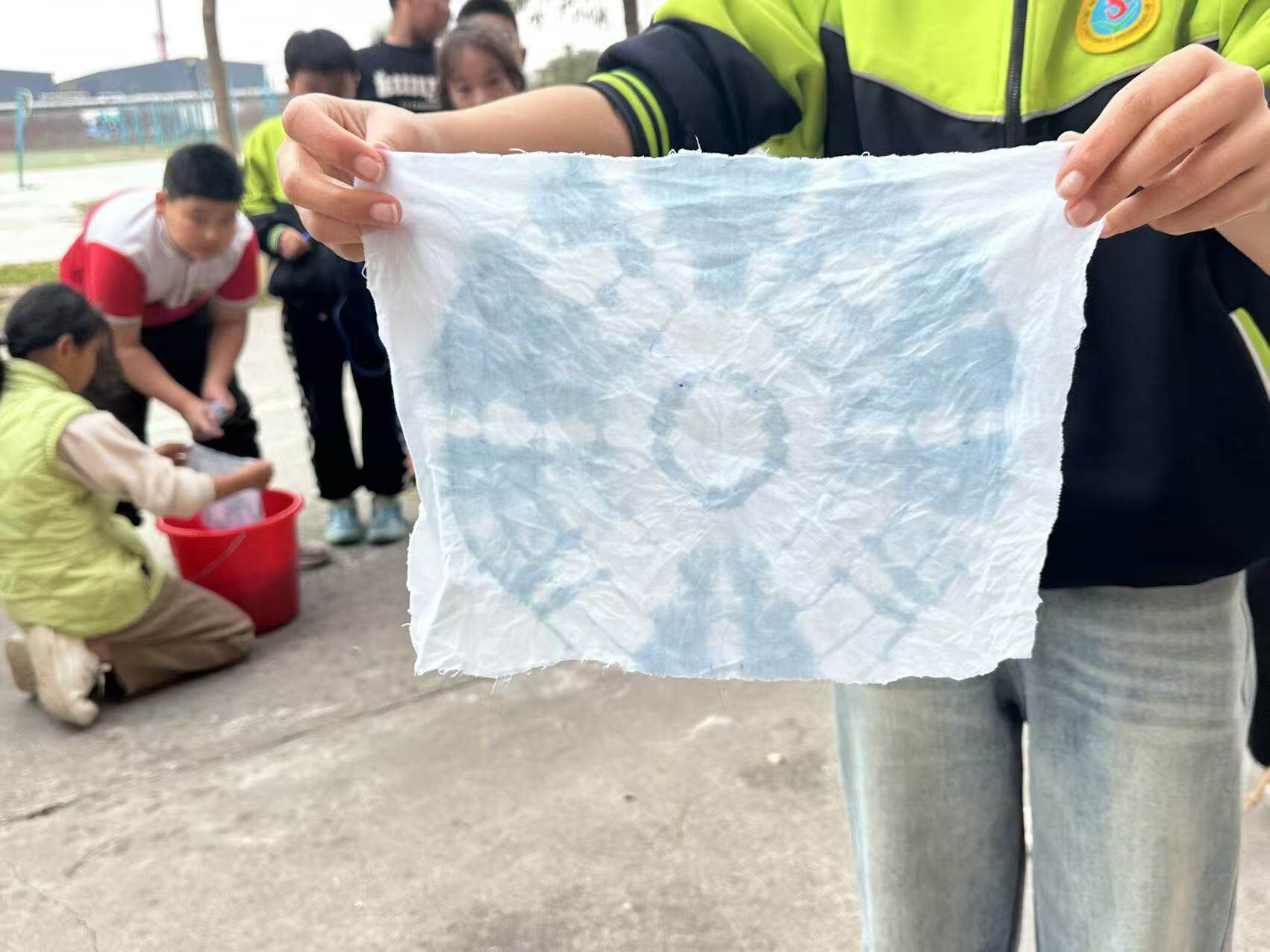 活动伊始,指导老师详细讲解了扎染的历史渊源与操作技巧,从布料折叠、绳结捆扎的松紧度把控,到染料调配、浸色时间的精准拿捏,逐一示范指导。扎染的妙处在于无法复制,每一个结、每一次折叠,都会让最终的花纹独一无二。
