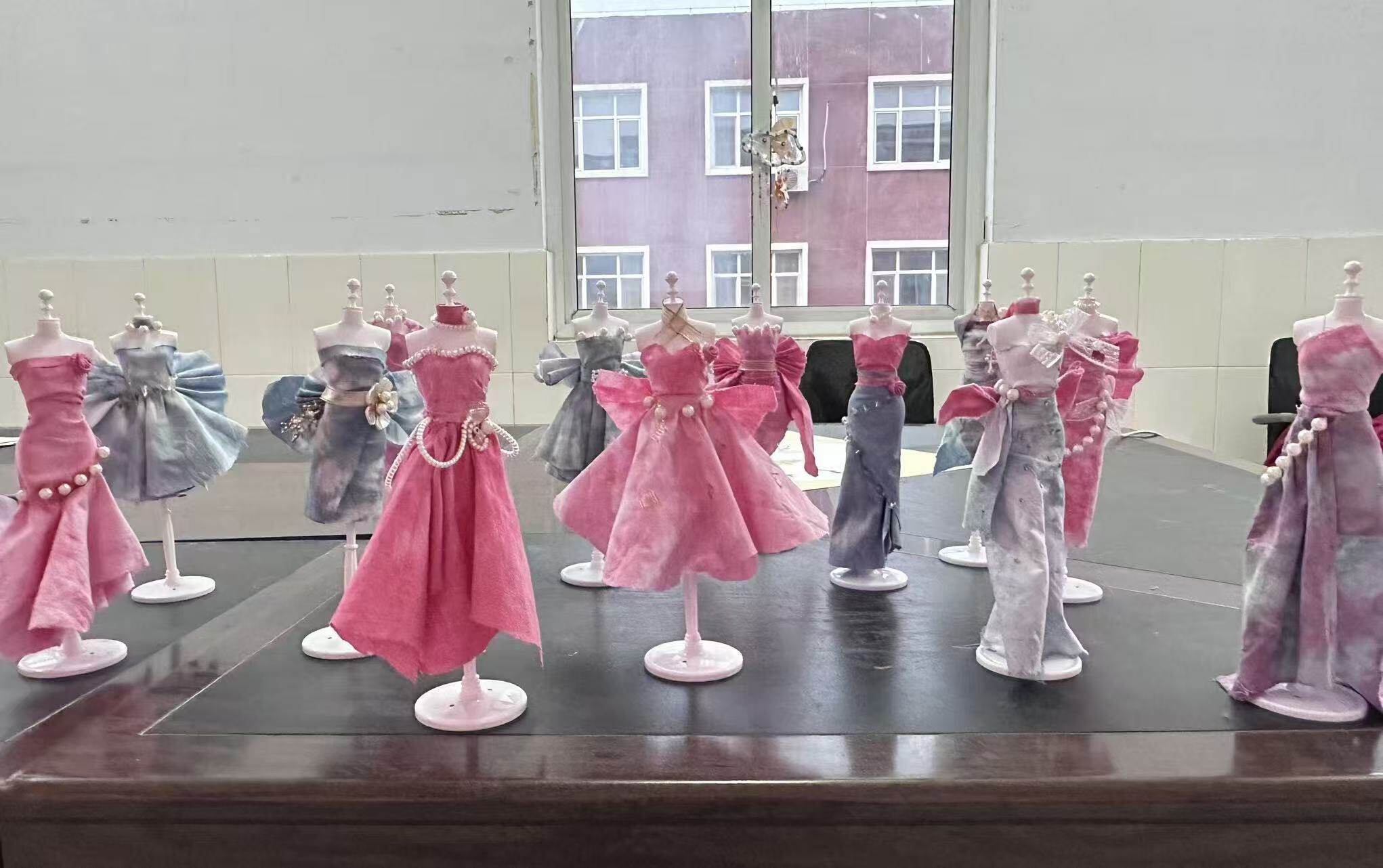 活动中,同学们先从扎染布料的创作开始,通过捆扎、浸染等传统工艺,让普通的布料焕发出斑斓的色彩与独特的纹理。大家以这些富有艺术感的扎染布料为原料,发挥天马行空的想象力,在迷你人体模型上设计制作扎染裙。