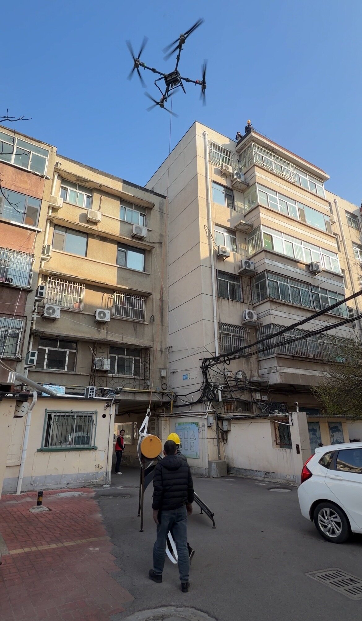 拆除现场,专业团队先在楼顶规范拆卸设备,再由吊装能力达150公斤的无人机分批吊运下楼。社区工作人员划定警戒区域、维护秩序。“以前刮风都不敢从楼下走,现在终于踏实了!”居民李阿姨看着清运的废旧设备连连称赞。