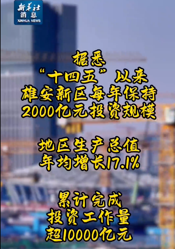 “十四五”以来,雄安新区每年保持2000亿元投资规模,累计完成投资工作量超10000亿元,地区生产总值年均增长17.1%。据新华网