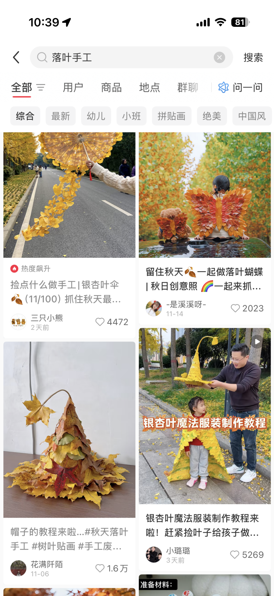 在各大社交平台上,“落叶手工”成为了热门话题。网友纷纷晒出自己的作品,有文章点赞量破万:用枫叶、梧桐叶折叠的玫瑰花,用层层叠叠的银杏叶或梧桐叶制成的花环、皇冠、魔法帽、蝴蝶翅膀,还有将落叶裁剪成星星形状,装入透明的玻璃瓶中,制成冬日“许愿瓶”。