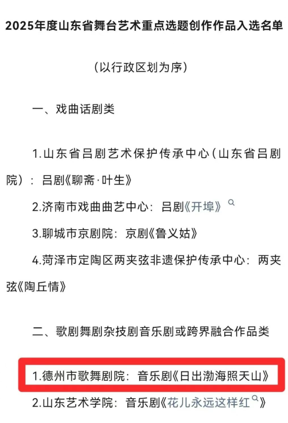 近日,由山东省文化和旅游厅组织的2025年度山东省舞台艺术重点选题创作作品评选工作结束,德州市歌舞剧院原创音乐剧《日出渤海照天山》入选。这是市歌舞剧院继2023年音乐剧《大地苍茫》后第二部入选该重点选题创作作品的剧目。
