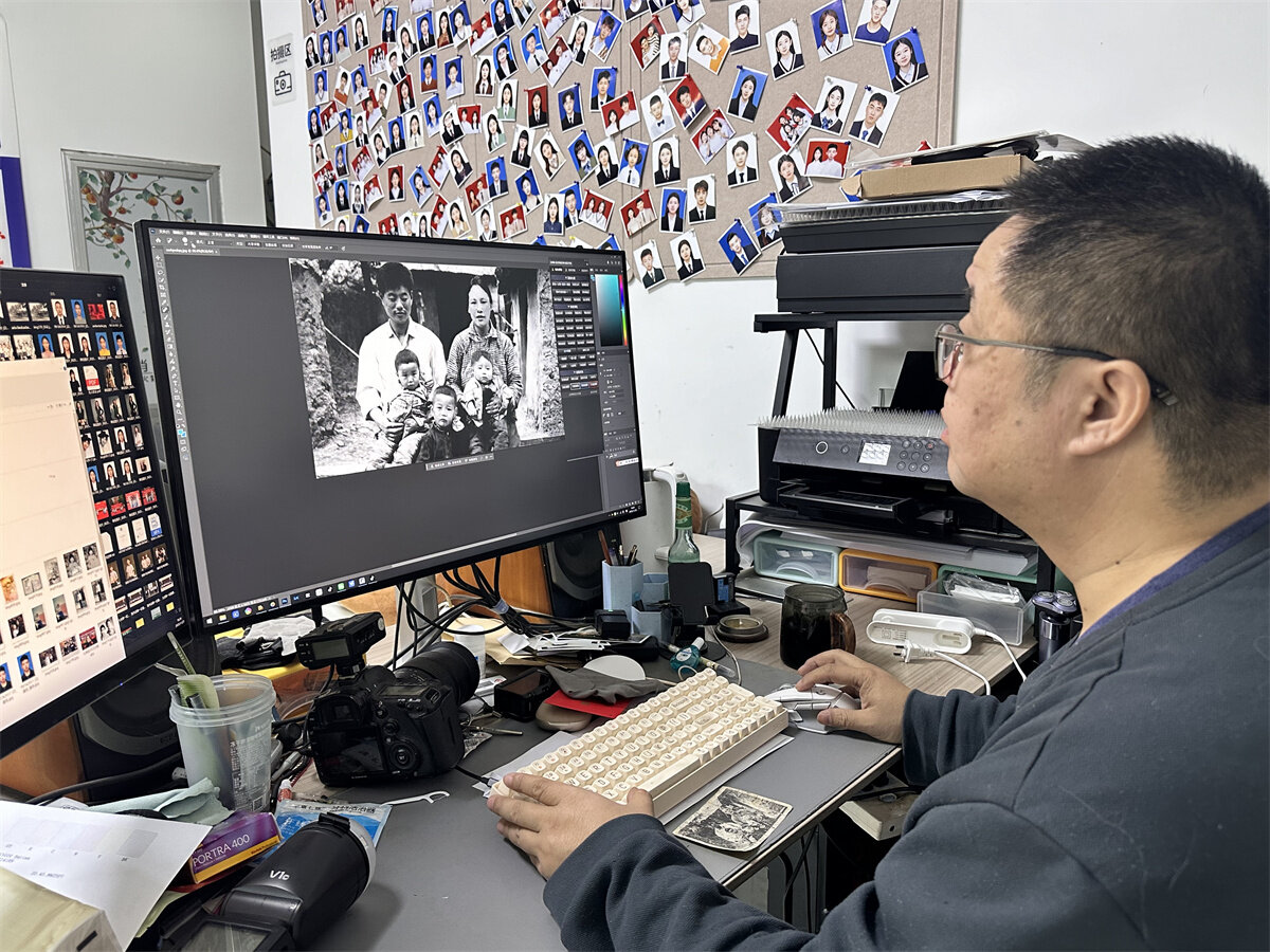 如果说胶片冲洗是与时光对话,那么老照片修复便是一场“时光修复术”。于滨的工作室里,摆放着许多等待修复的老照片,有的泛黄发脆,一触即碎;有的撕裂破损,影像残缺;还有的被霉菌侵蚀,细节模糊。而经过他的双手,这些濒临“消失”的记忆总能重归完整。