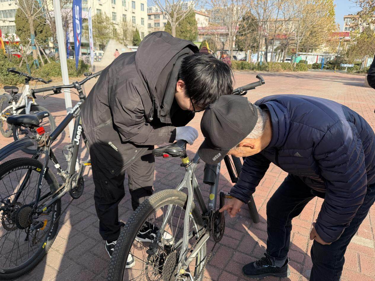 在社区广场,“自行车维修进社区”便民服务也在同步进行。维修师傅们自带工具,认真为居民检查车辆刹车、链条、轮胎等部件,细致完成调试、紧固、补胎等服务,还耐心解答居民日常骑行中的保养疑问。“家门口就能免费修自行车,太方便了!”居民们纷纷为这项贴心服务点赞。