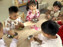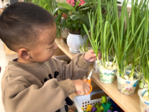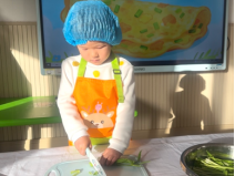 从种下蒜种那天起,孩子们就成了“小园丁”:每天晨间给蒜苗添水、观察叶片生长的高度。等到蒜苗冒尖、叶瓣舒展,孩子们便拿着小剪刀,小心剪下嫩绿的蒜苗,排队到温水槽边轻轻冲洗、仔细控干水,再跟着老师学用儿童安全刀把蒜苗切成细碎的小段。