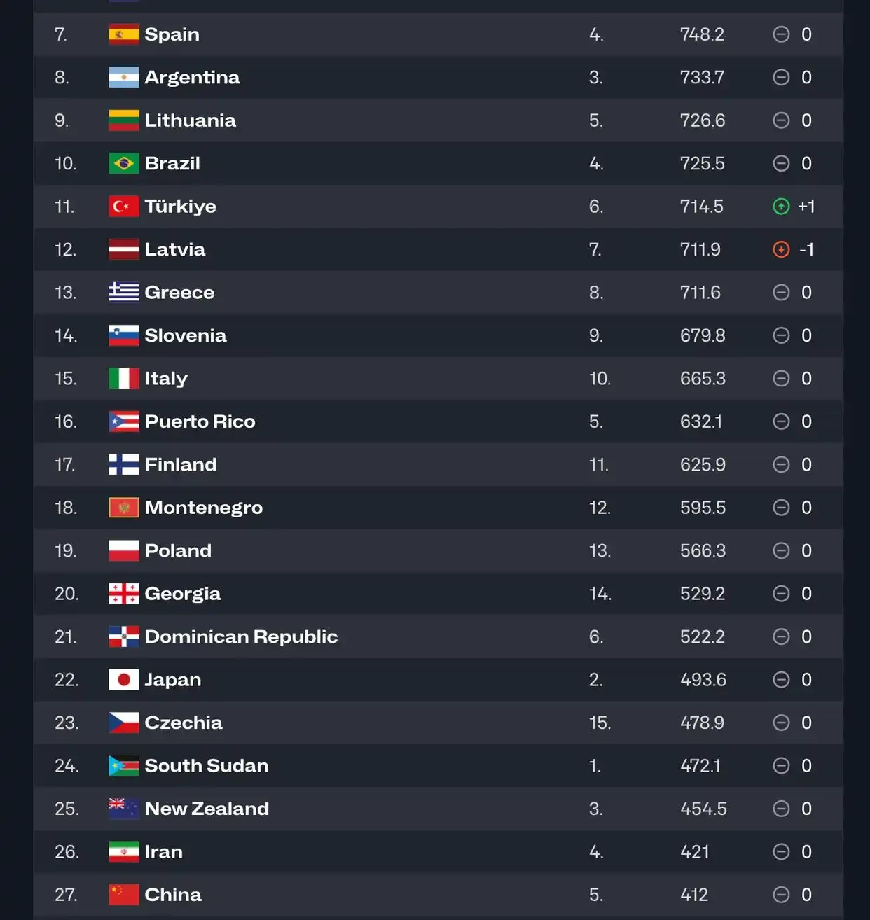 国际篮联4日公布了最新一期世界男篮排名,前十名位置没有任何变化,中国男篮依旧位列第27位。本次排名是2027年男篮世界杯预选赛第一窗口期的所有比赛全部结束之后公布的。在这个窗口期,中国男篮两度输给韩国队。韩国队的积分因此有所提升,但对其世界排名帮助不大,仍排在第56位。亚洲球队中,排名最高的仍然是澳大利亚队(世界排名第六),其次分别为日本队、新西兰队和伊朗队,中国队位列亚洲区第五。据新华社