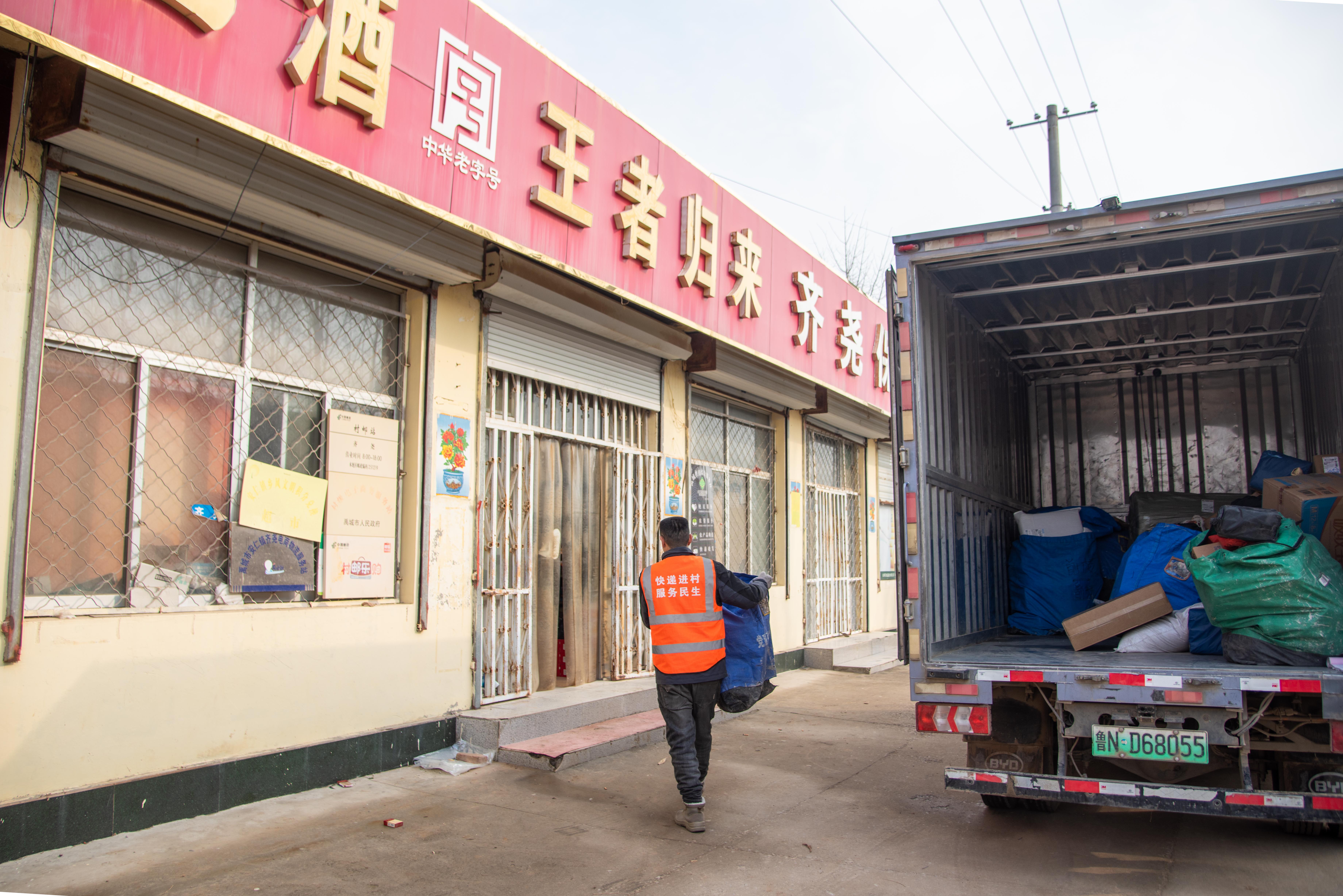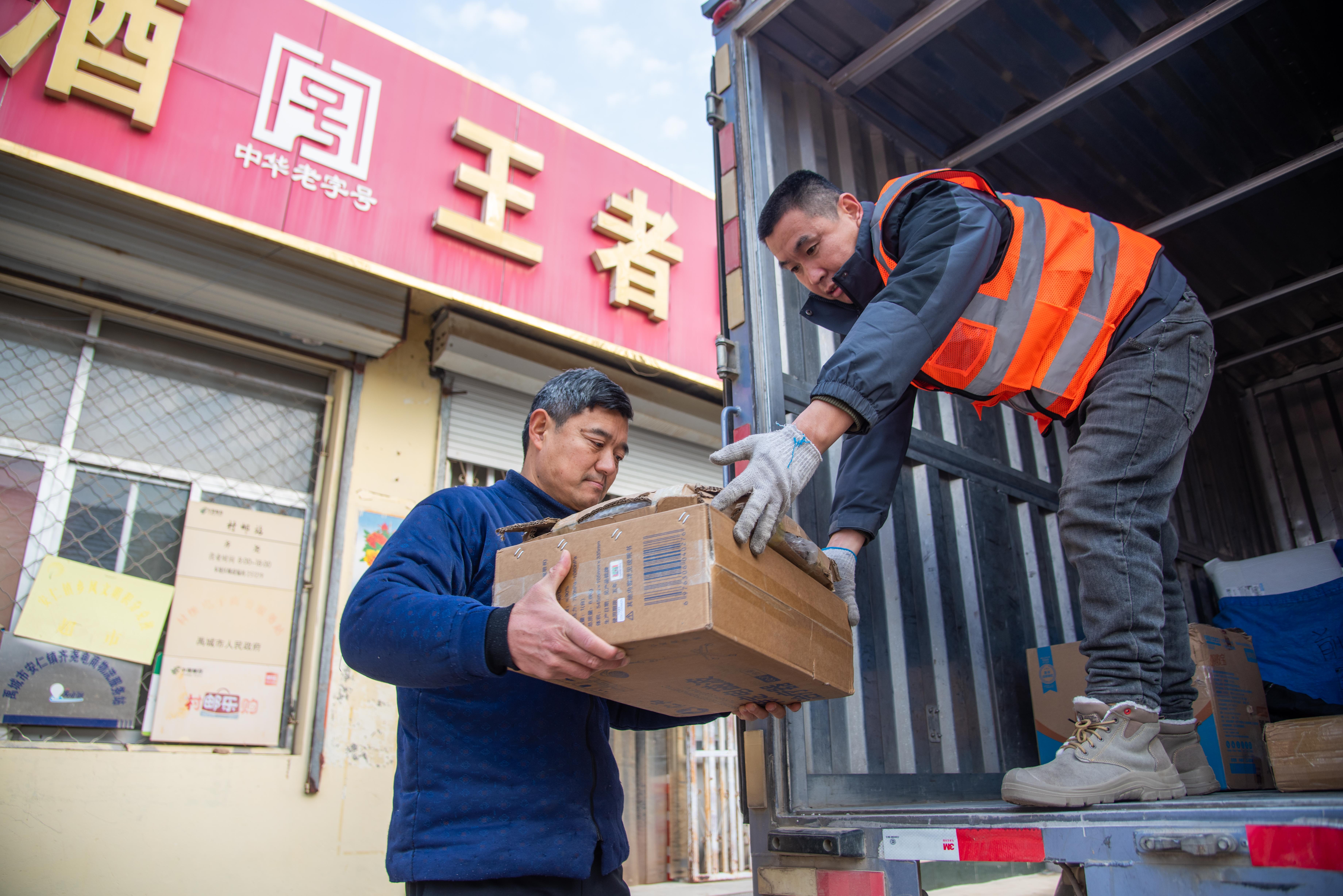 齐尧村是他的第一站。服务点设在超市内,刘超熟练地协助店主庞小连卸下包裹。“每天上午、下午各送一趟,日均配送五六百件。”刘超说,遇到“双十一”“6·18”等节点,日配送量可达千件左右。为让村民早点收到快递,那时他一天要跑三四趟。