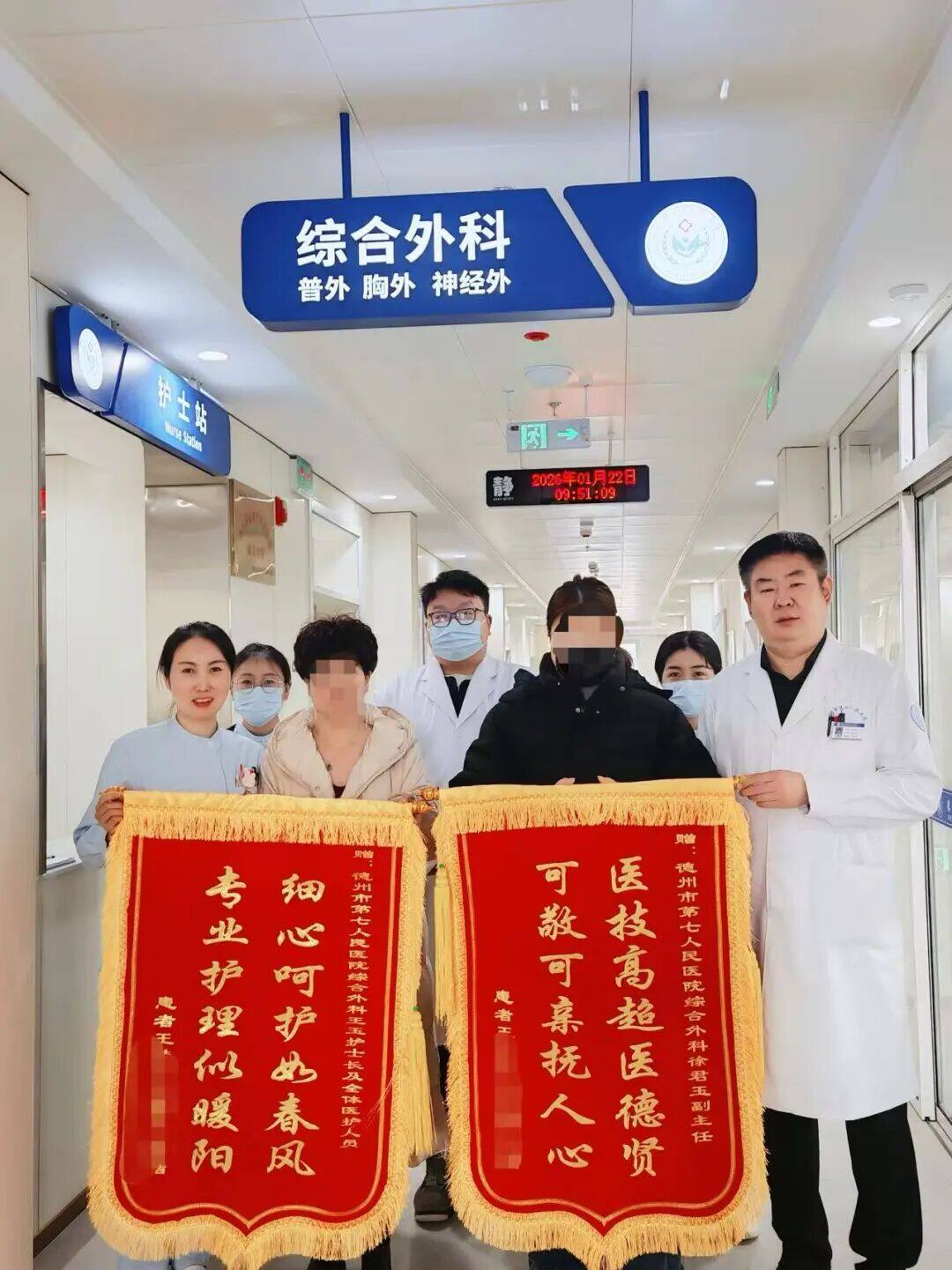 冬日暖阳映初心,锦旗致谢传温情。年末将至,德州市第七人民医院综合外科接连迎来暖心时刻——甲状腺手术后康复患者与车祸外伤康复患者及其家属,分别于1月21日、22日专程重返科室,将饱含感激之情的锦旗送到两腺外科负责人徐君玉及团队手中,以最朴实的方式表达对团队精湛医术、优质服务的高度认可与诚挚谢意。