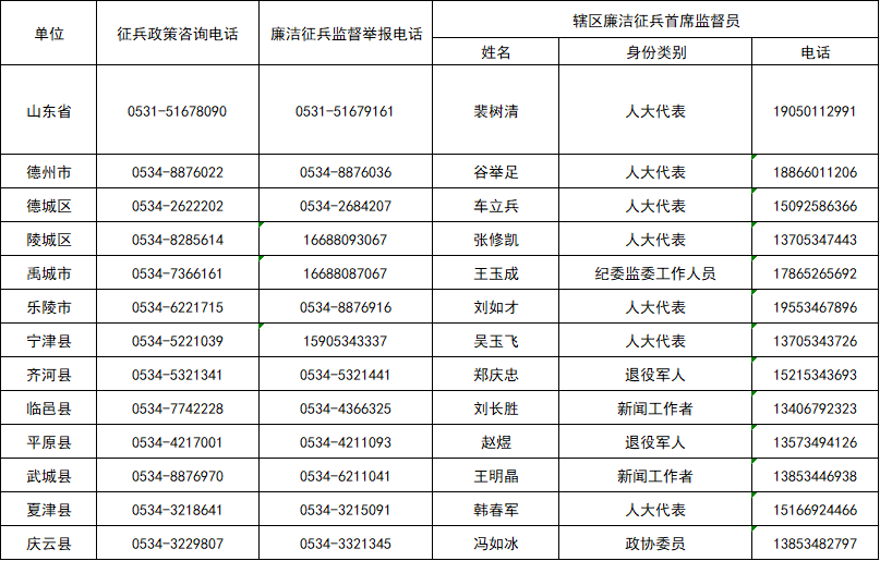 为认真落实健全全面从严治党体系任务要求,深入推进新时代征兵领域廉政建设,进一步加强群众和舆论监督,权威解读政策规定,及时回应社会关切,确保廉洁征兵工作落细落实,现向社会公开我市各级征兵政策咨询、廉洁征兵监督举报电话,欢迎社会各界对征兵工作进行监督。