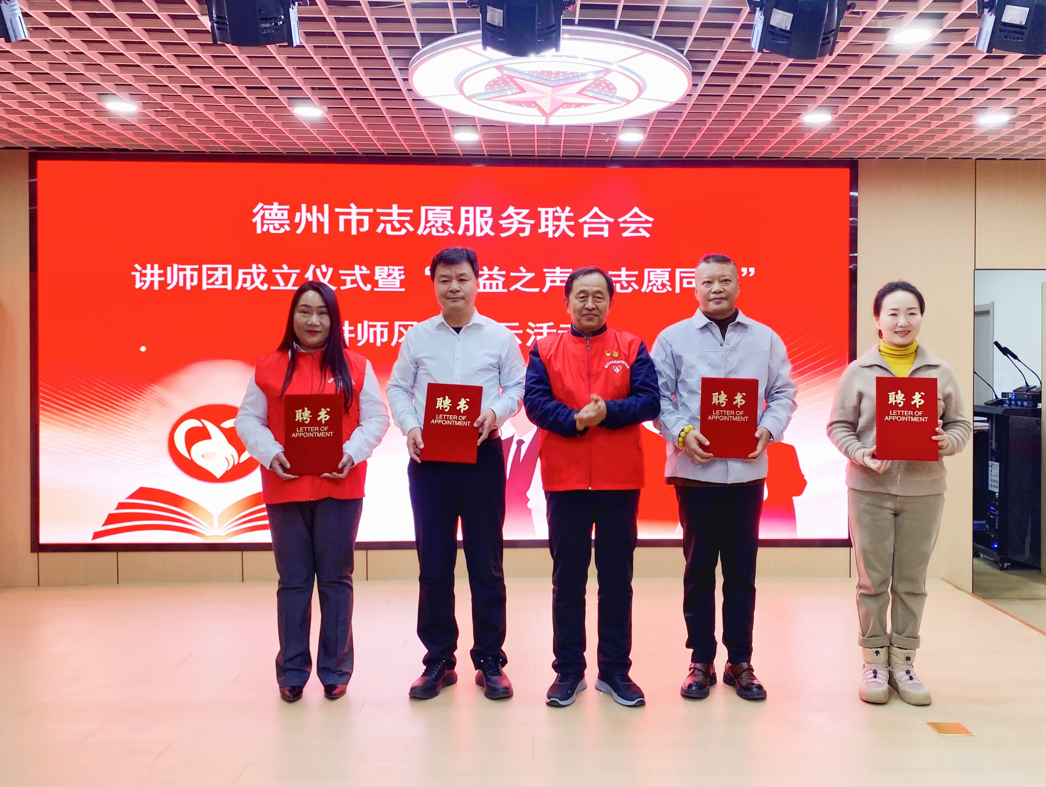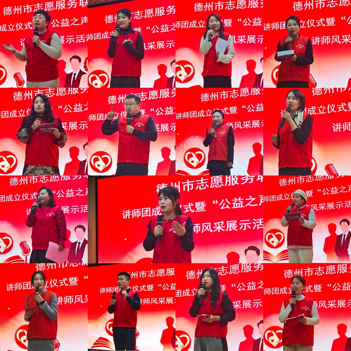 1月25日,德州市志愿服务联合会讲师团成立仪式暨“公益之声·志愿同行”讲师风采展示活动在德州市心理健康服务促进会、《时代强国》栏目组德州制作中心多功能厅举行。德州市志愿服务联合会党总支书记、会长周成玉,德州市广播电视台党委副书记马清水,央媒《时代强国》栏目组制作中心主任韩立刚,德州市文化馆党支部副书记、副馆长刘彦,德州市志愿服务联合会监事长、轮值会长陈建明,联合会党总支副书记、轮值会长姜纪军,联合会轮值会长、讲师团总监李占钢,联合会副会长王丽芳、段玉峰、林凤菊,德州市心理健康服务促进会会长段红英,德州市志愿服务联合会讲师团团长、绿迅演说创始人魏萍,及讲师团成员、志愿者代表100余人参加活动。
