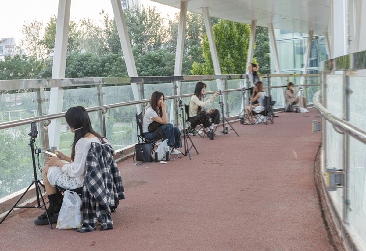 2025年9月7日,德州市文化路过街天桥,很多年轻人正在直播。