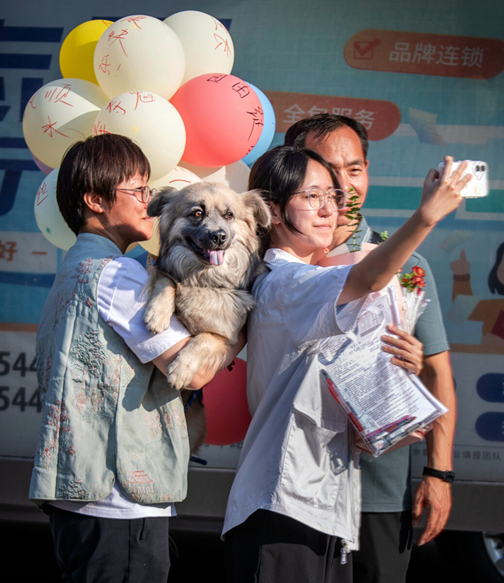 2025年6月10日,德州市第一中学校门口,结束高考后的学生与家人和宠物狗一起合影。