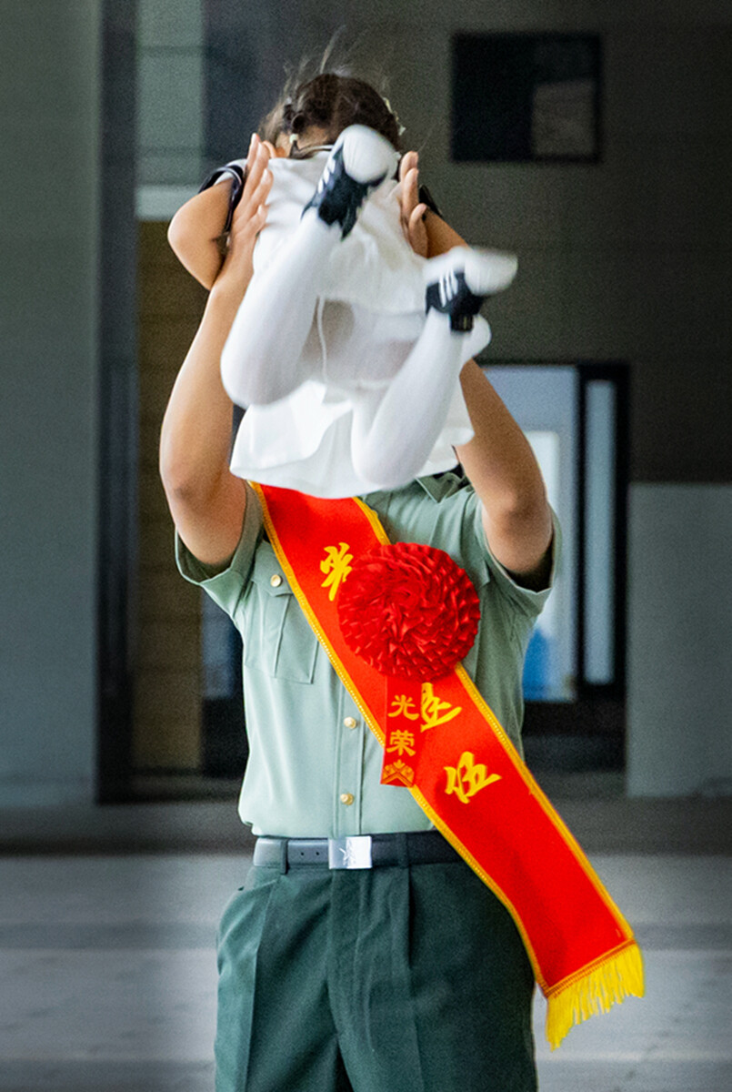 2025年9月5日,淄博高铁站广场。一名退役军人将迎接自己回家的孩子高高举起。