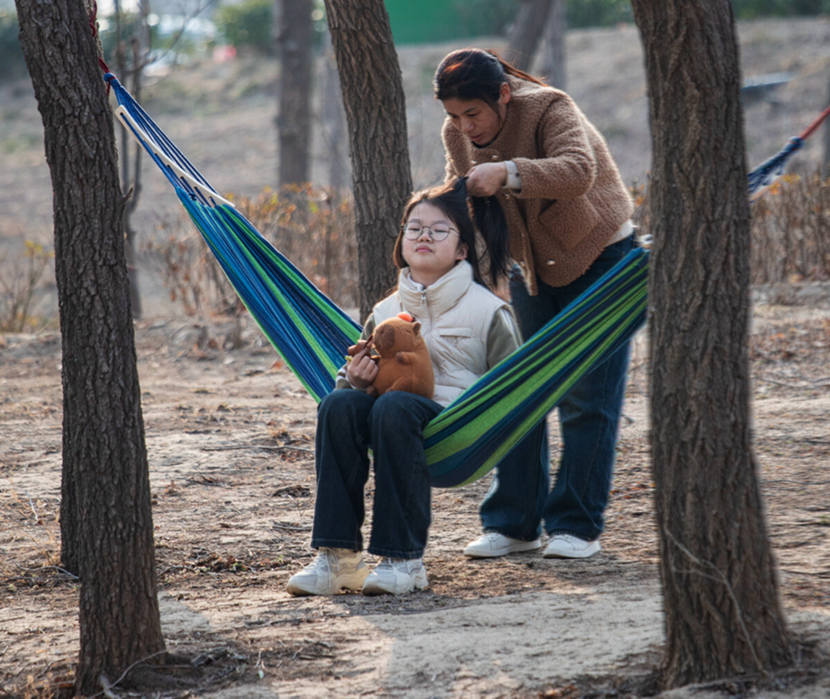 2025年3月9日,德州市锦绣川风景区,游玩的母女俩,母亲为孩子扎辫子整理头发。