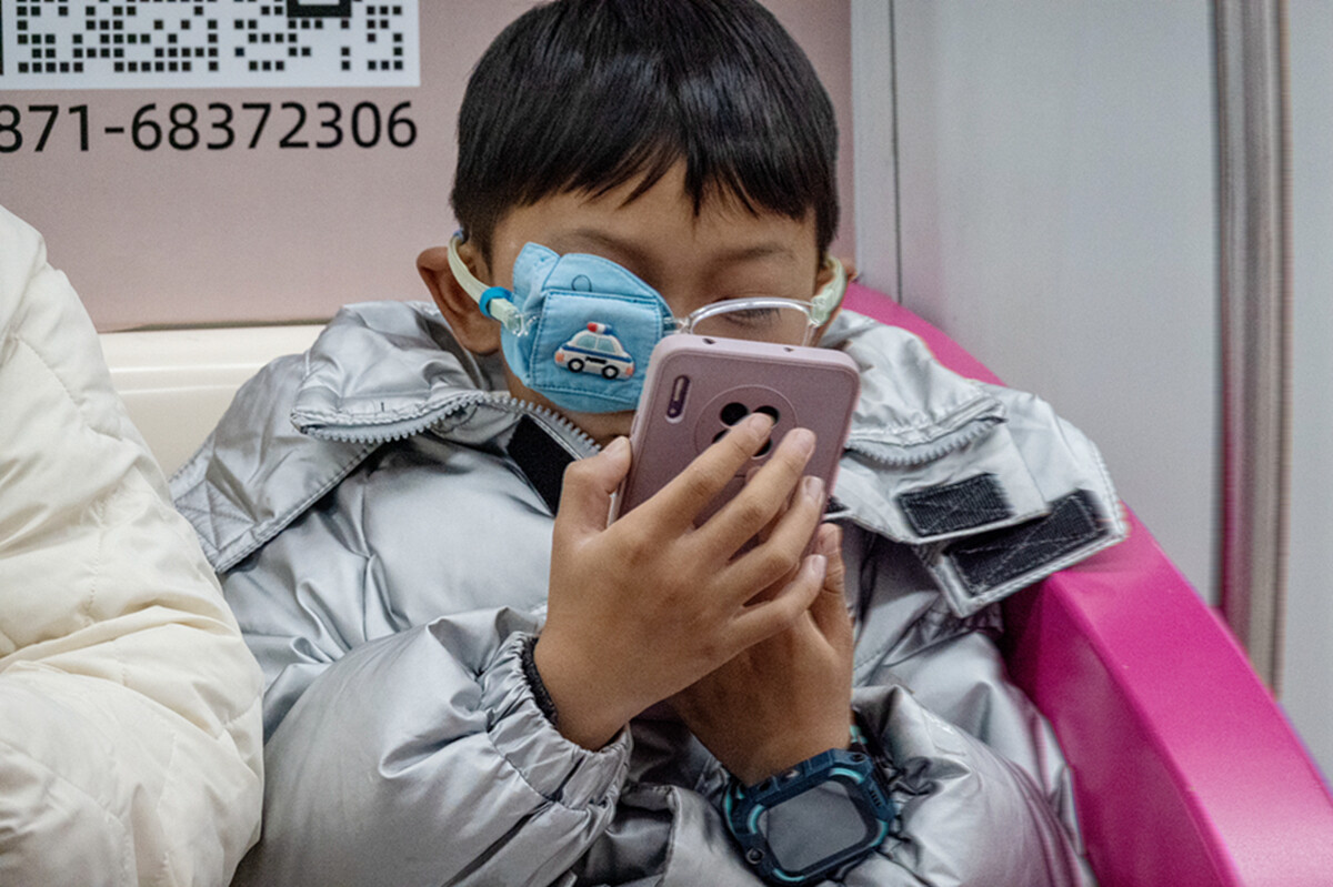 2025年2月18日,地铁车厢内,一名佩戴矫正视力眼镜的少年在观看手机。