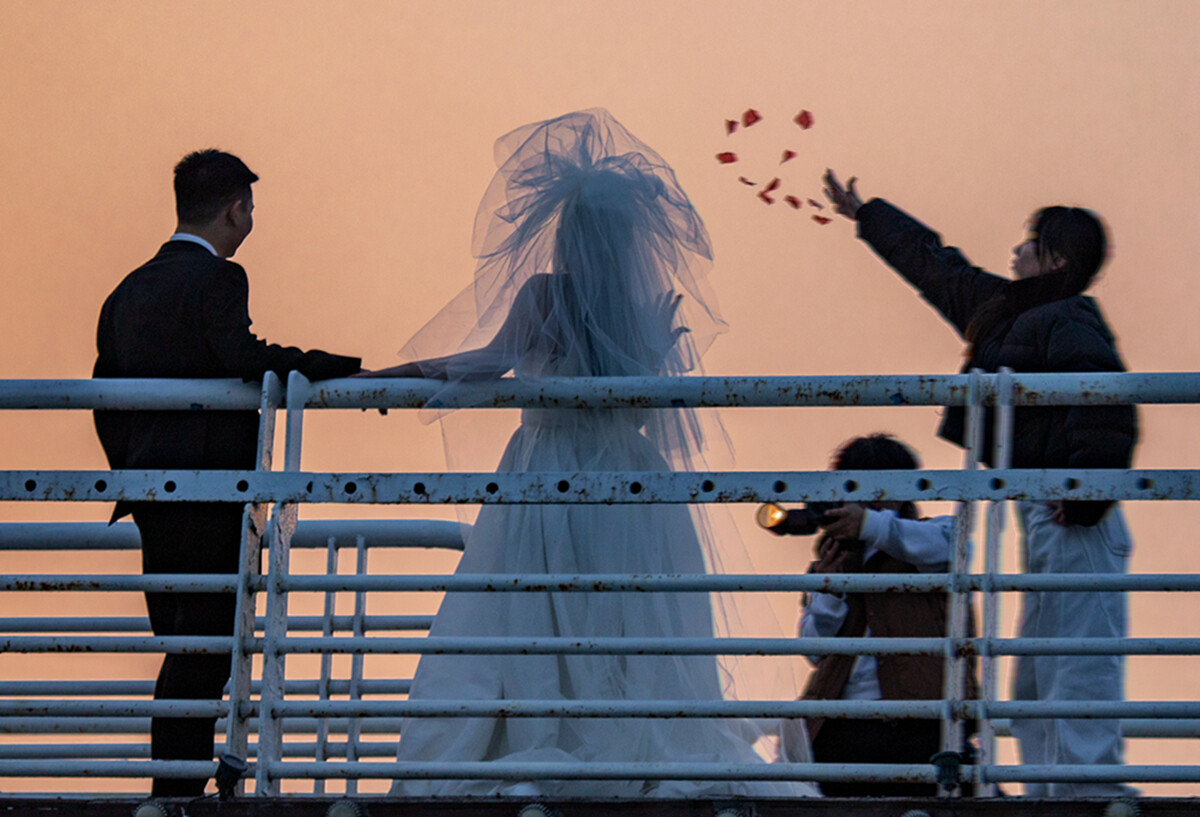 2025年11月8日,德州市长河公园景区,一对在桥上拍摄婚纱照的情侣。