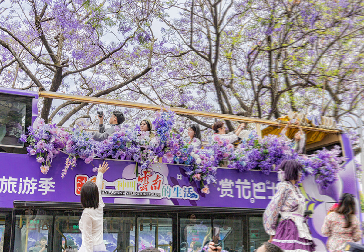 2025年5月2日,昆明市五华区教场中路,紫色蓝花楹竞相绽放,引来众多游客观赏。