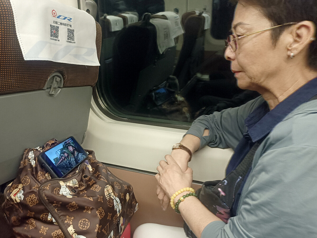 2025年9月3日,高铁车厢内。一名旅客通过手机观看纪念世界反法西斯战争暨中国人民抗日战争胜利80周年阅兵式,激动地自语:我们胜利了,我们胜利了。