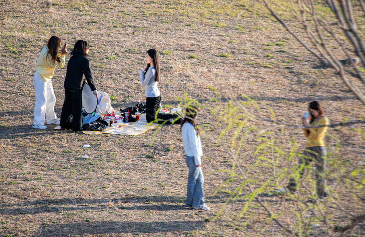 2025年3月22日,德州市锦绣川风景区,几位年轻的女孩踏青拍照。