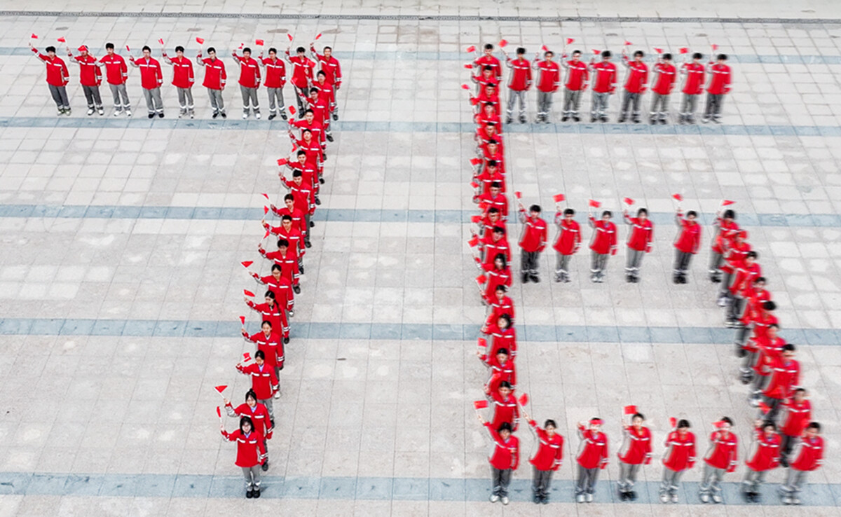 2025年9月22日,华鲁恒升研发园。职工着红色工装排列成76数字造型挥舞国旗,拍摄庆祝建国76周年宣传视频。