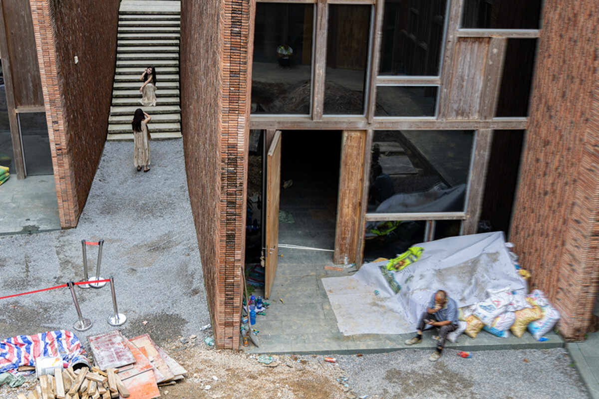 2025年5月23日,江西南昌陶阳里御窑遗址,打卡拍照的游客和施工休息的工人。