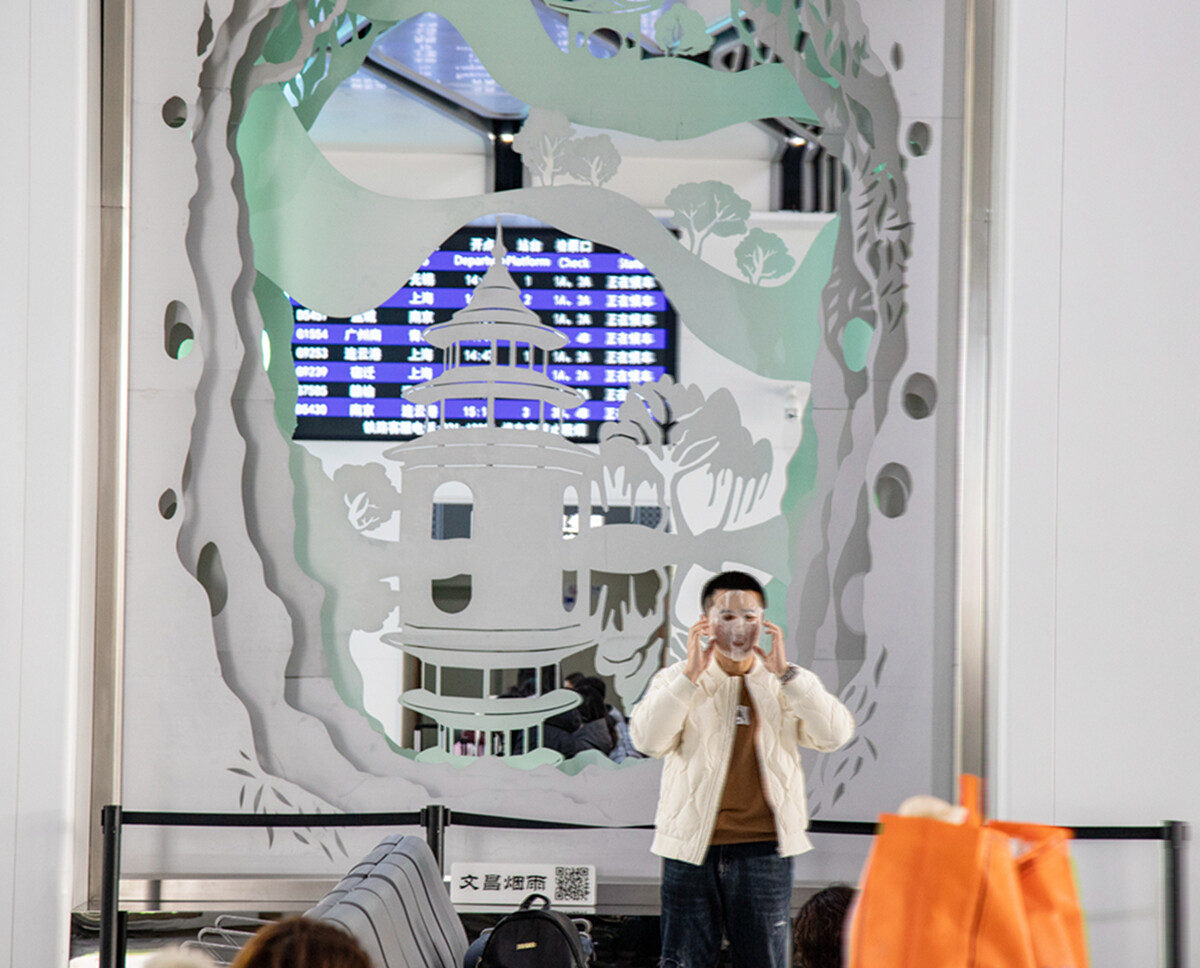 2025年2月4日,扬州高铁站候车区,一名男性旅客在候车间隙敷面膜。