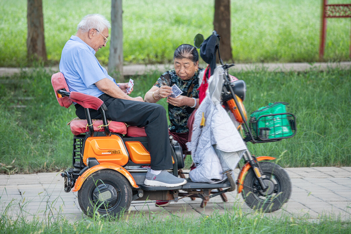 2025年8月31日,德州市锦绣川风景区,两位老人在三轮车上打扑克。
