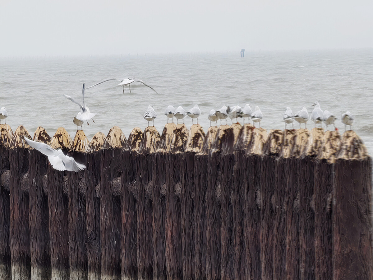 2025年12月23日,无锡太湖,整齐排列在木桩上小憩的海鸥。