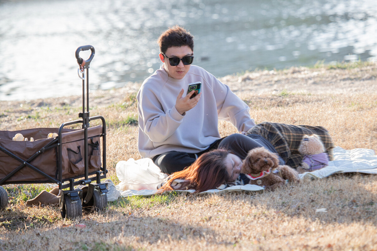 2025年3月22日,德州市锦绣川风景区,带着宠物狗和玩具狗在河边休息的市民。