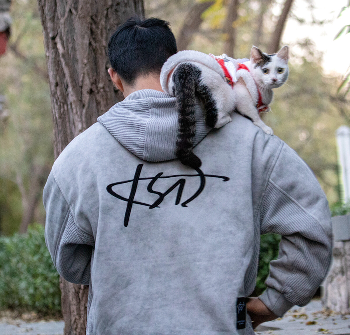 2025年11月9日,德州市九龙湾公园,一位游玩的市民肩扛着宠物猫。