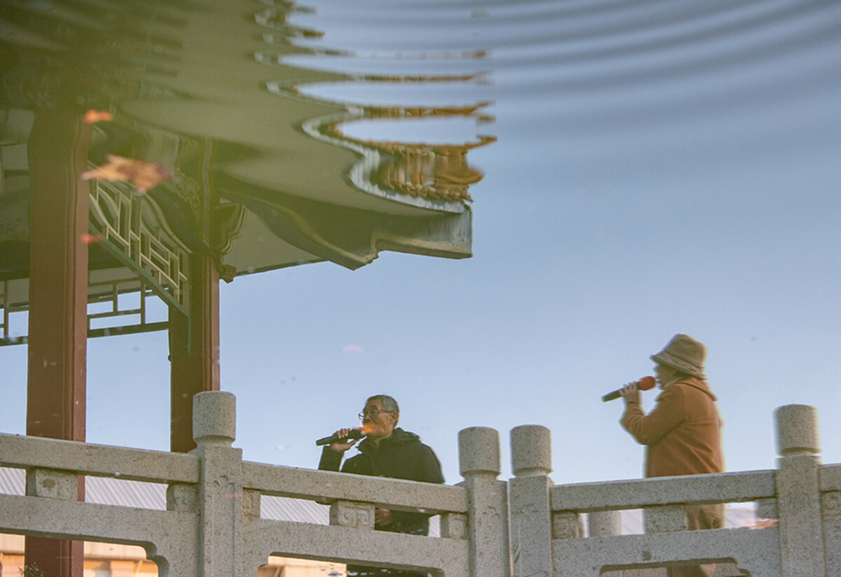 2025年11月1日,德州市新湖公园,市民在凉亭唱歌的身影倒映在湖面。