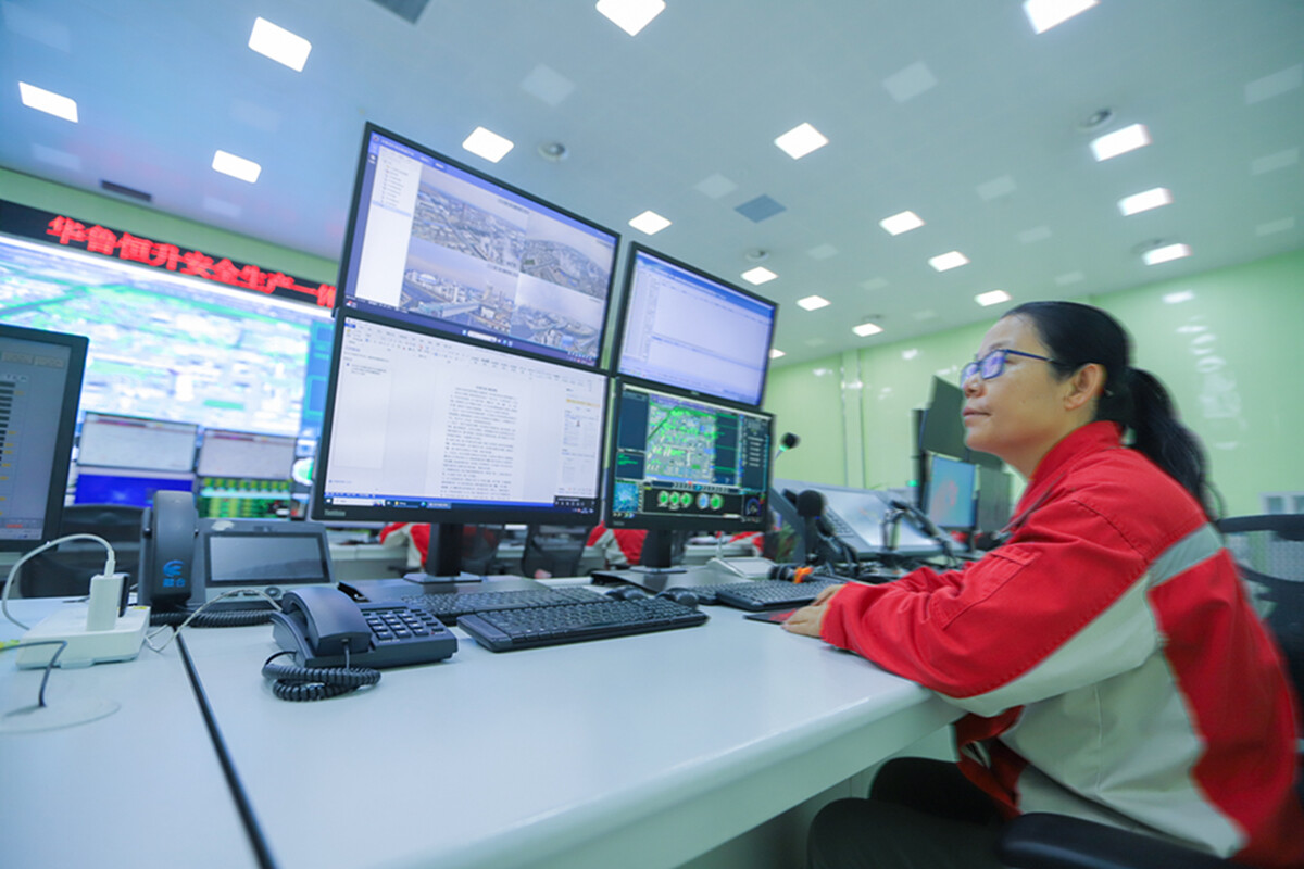 2025年10月21日,华鲁恒升集控室,大国工匠人才获得者孙一倩观察设备运行情况。