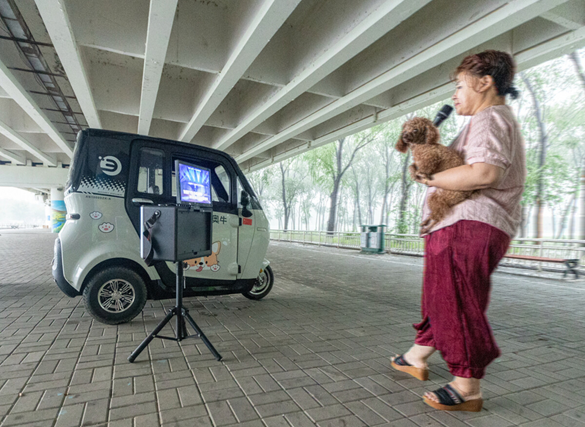 2025年8月16日,德州市岔河景区桥下,市民怀抱宠物狗唱卡拉OK 。