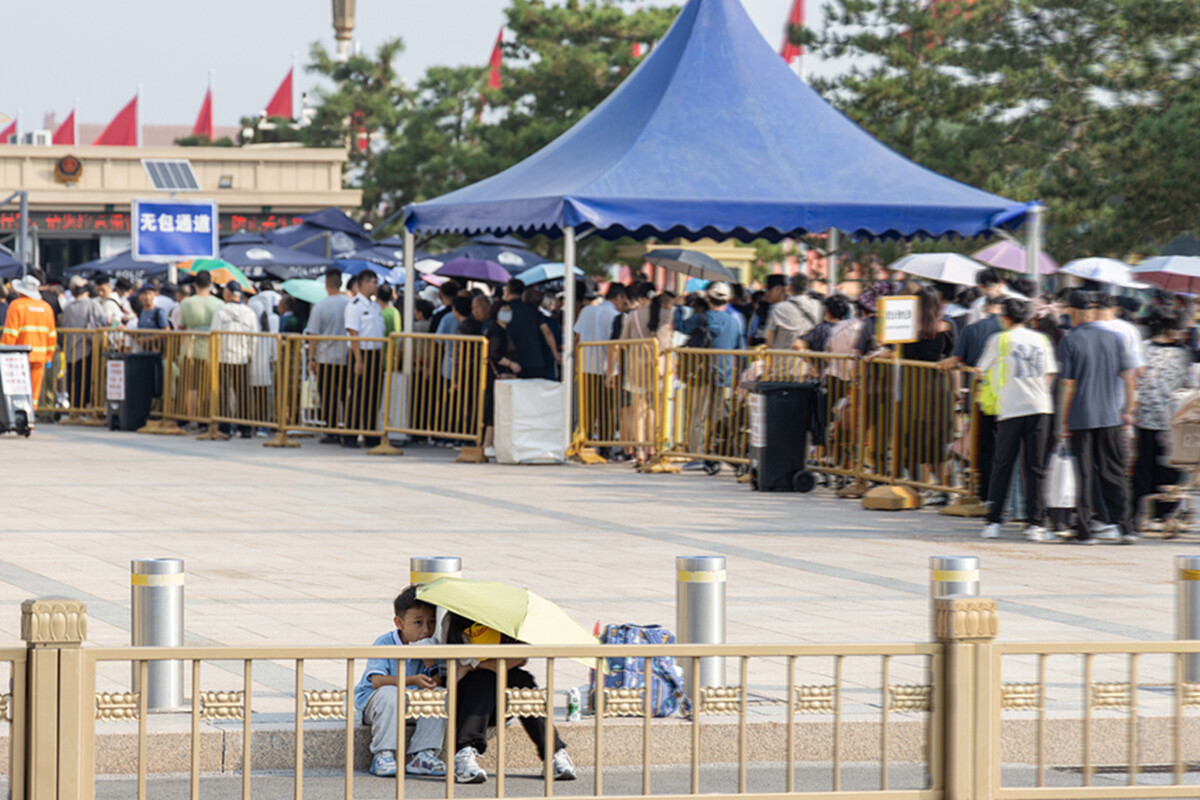 2025年9月13日,北京天安门广场,一对母子撑伞遮挡日晒等候安检。