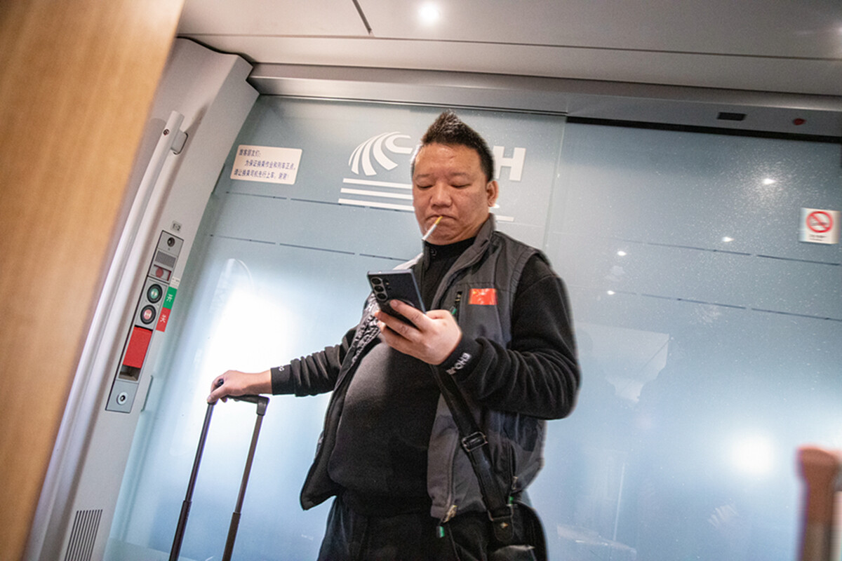 2025年4月6日,高铁车厢。一位旅客叼着香烟,等候在车门口随时准备下车抽烟。