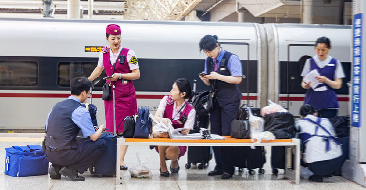 2025年5月25日,南昌高铁站站台,结束工作的列车乘务组工作人员。