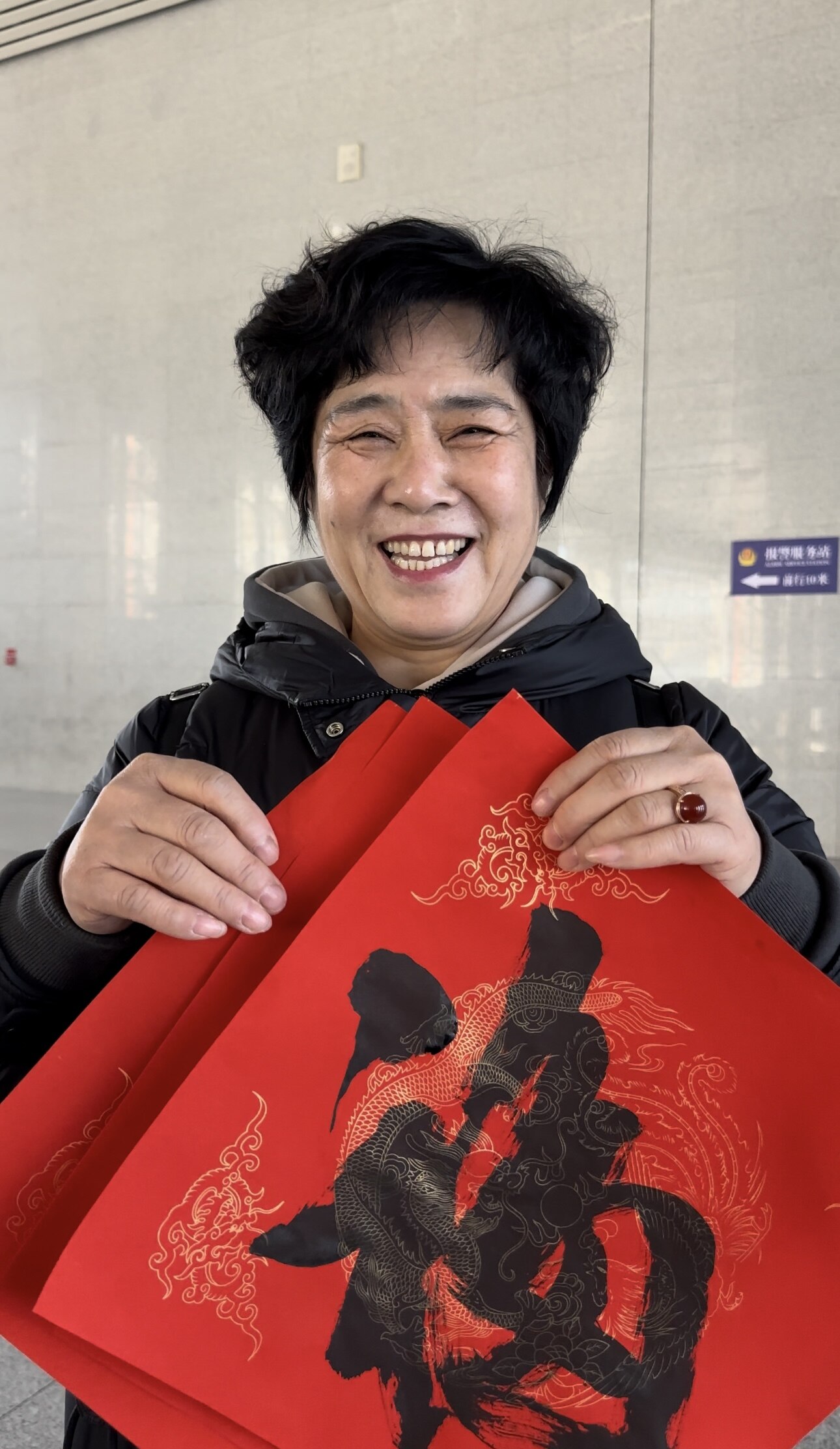 手持福字的邱女士则有着别样的行程,她要去天津儿子家接孙子回德州过年。“孙子放假了,接回来一家人热热闹闹过个年。”邱女士扬了扬手里的福字,眉眼弯弯,“这是车站送的福字,我要带到天津,儿子、儿媳、孙子一人一张,希望我们一家人2026年福满多多。”