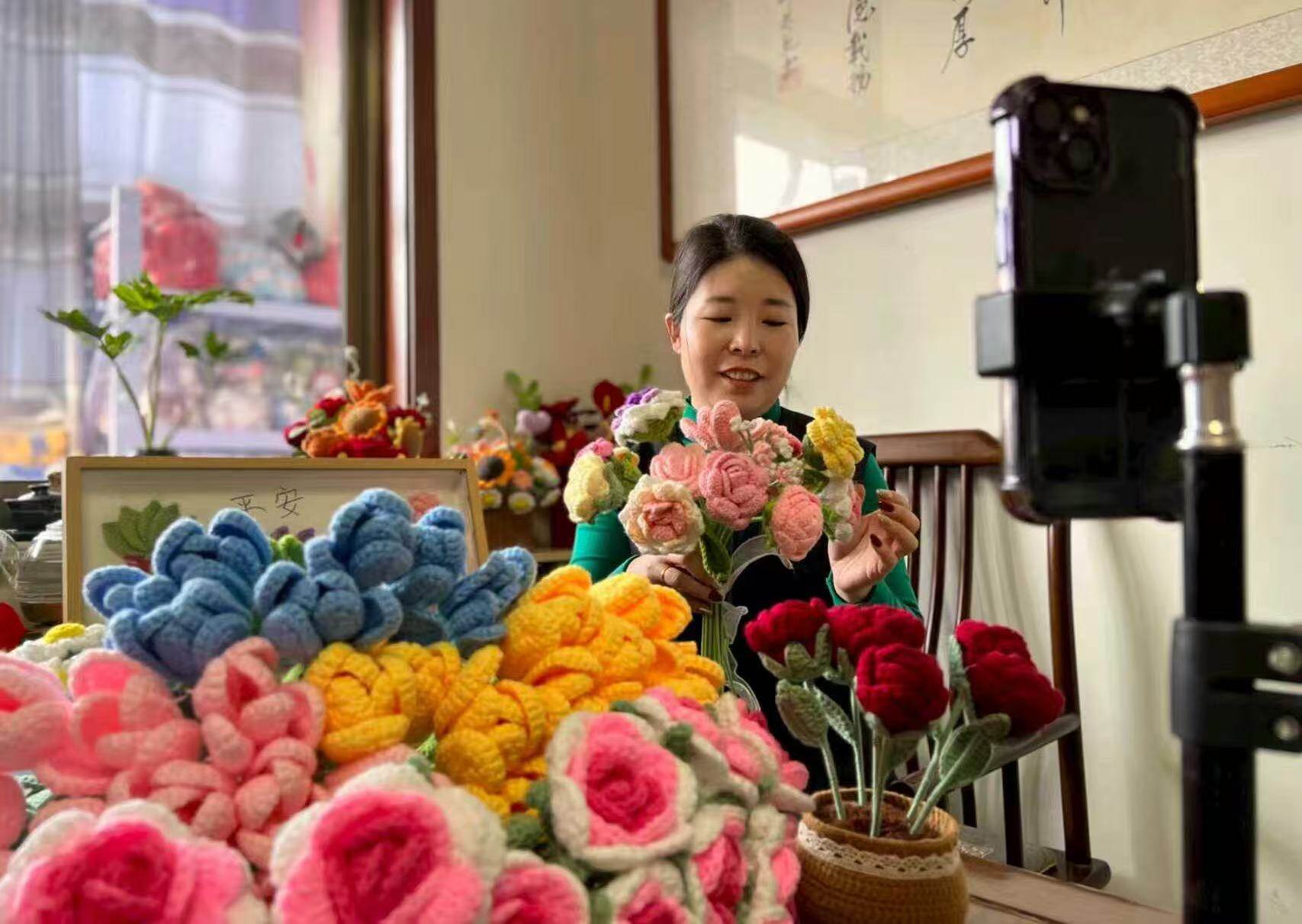 “巾帼好物来啦!纯手工仿真花、小挂件,新年装点超合适!”近日,在庆云县中丁乡茂杨村,主播何倩倩正热情地向直播间粉丝介绍各类毛线饰品。镜头前,牛奶棉与纤维编织的仿真花款式多样,既为新春添彩,更承载着当地妇女创业、非遗传承的“她”力量。