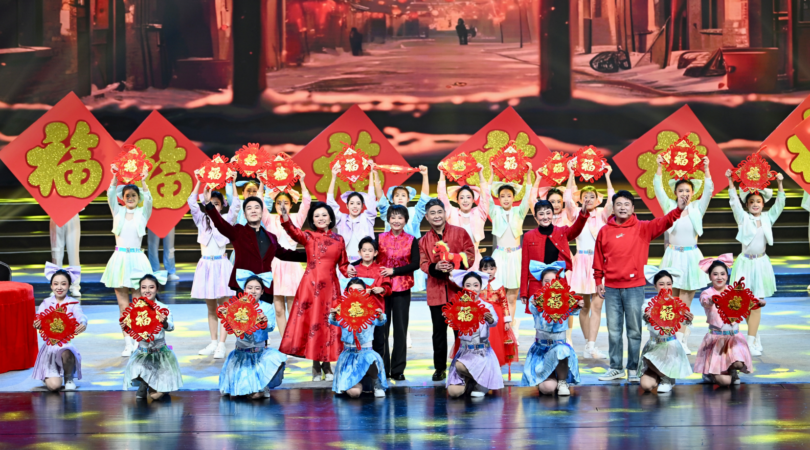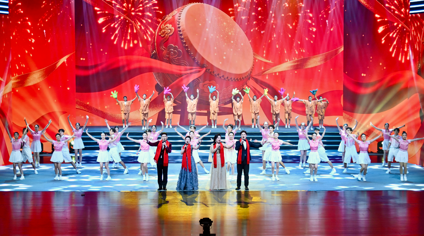 晚会以一场气势磅礴的开场歌舞《骐骥驰骋踏新春》拉开序幕。舞者们用矫健有力的舞姿,生动诠释出德州人民在新征程上昂扬向上的奋斗姿态,瞬间点燃了现场的热烈气氛。随后四位主持人向全市人民送上新春祝福,“万马奔腾”“龙马精神”“马到成功”等蕴含“马”元素的吉祥话语接连不断,寄寓着对新一年德州发展的美好期许。