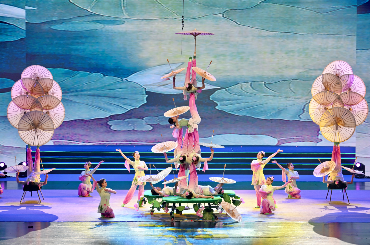 文化传承与艺术创新在当晚的舞台上相得益彰。德州市杂技团带来的《荷塘月色—蹬伞》,将高难度的蹬技与江南水乡的静谧意境完美结合,演员们凭借精湛技艺,让花伞在足尖轻盈流转,令人赞叹不已。戏曲联唱《锦绣梨园》汇聚了京剧、庆云哈哈腔、临邑一勾勾等,国粹艺术与地方非遗剧种同台争艳,呈现出梨园百花齐放、共贺新岁的繁荣景象。