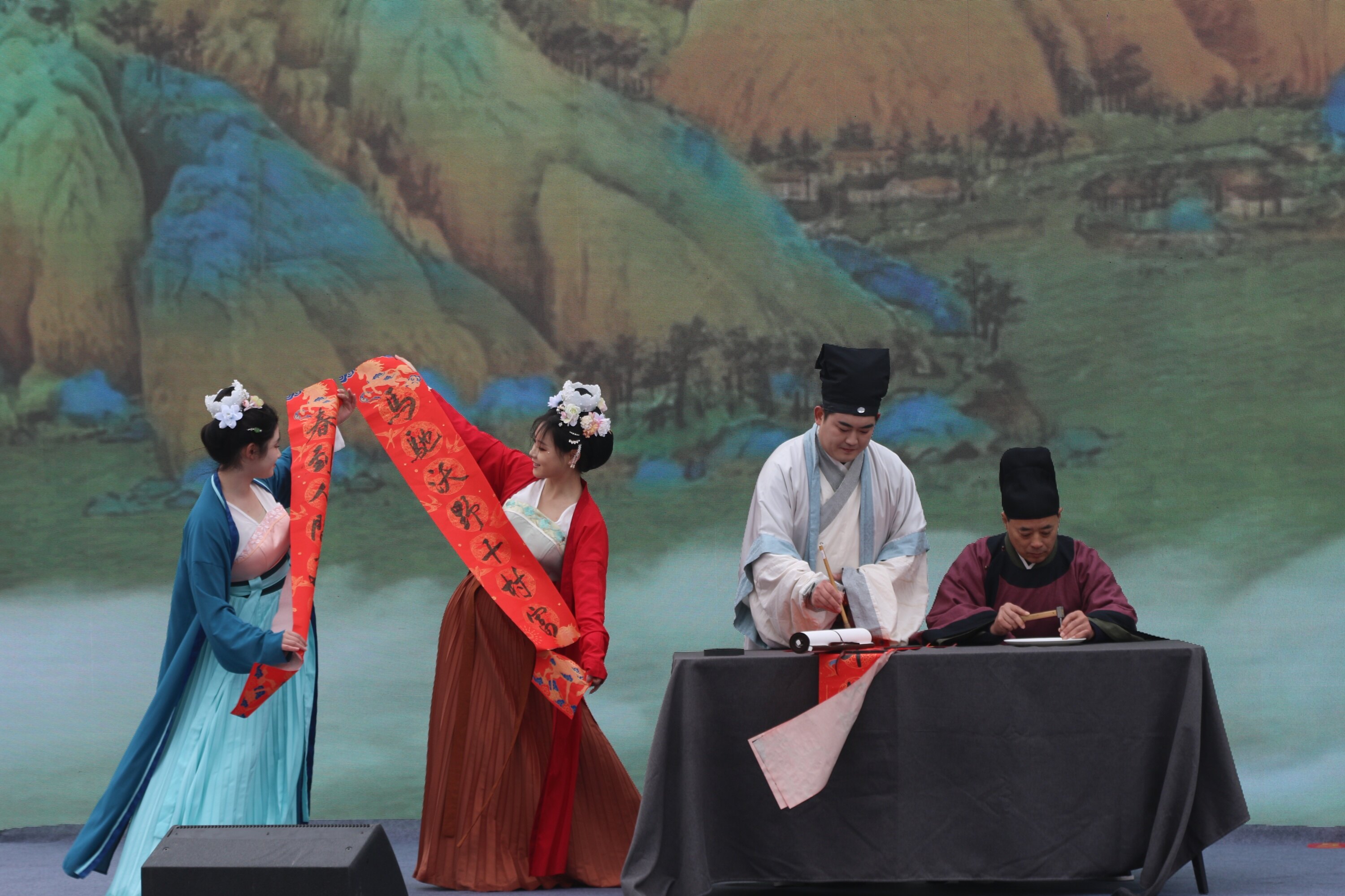 现场,音乐环绕,舞姿欢快,舞龙民俗艺术展演拉开帷幕。一场《宋潮雅集》情景表演将游客带入古韵悠长的氛围,演员衣袂飘飘,再现宋风雅趣。十余名书法爱好者凝神于铺开的长卷,挥毫泼墨,一个个“福”字渐次呈现。各类民俗接连上演,精湛的非遗技艺引来喝彩。