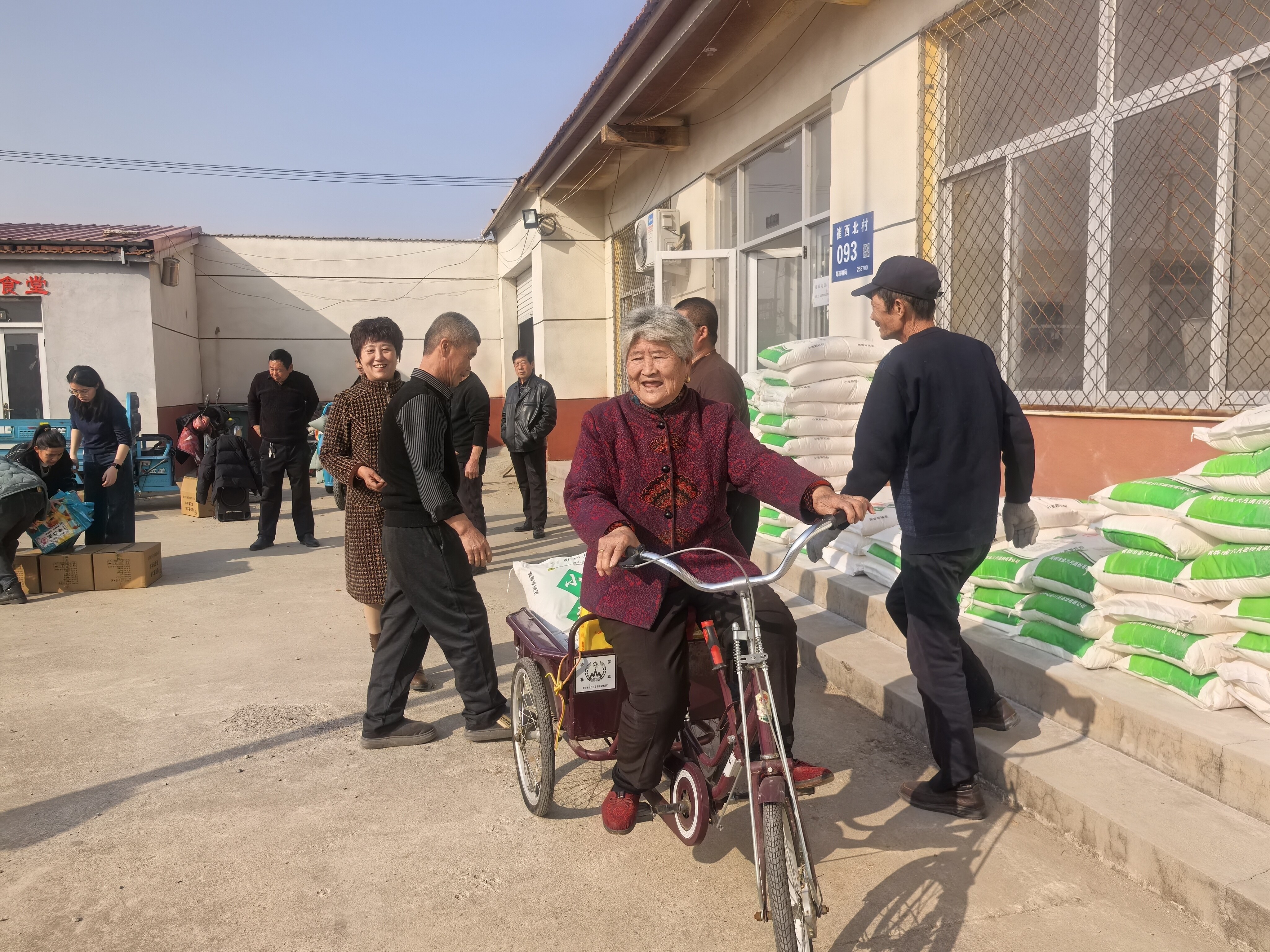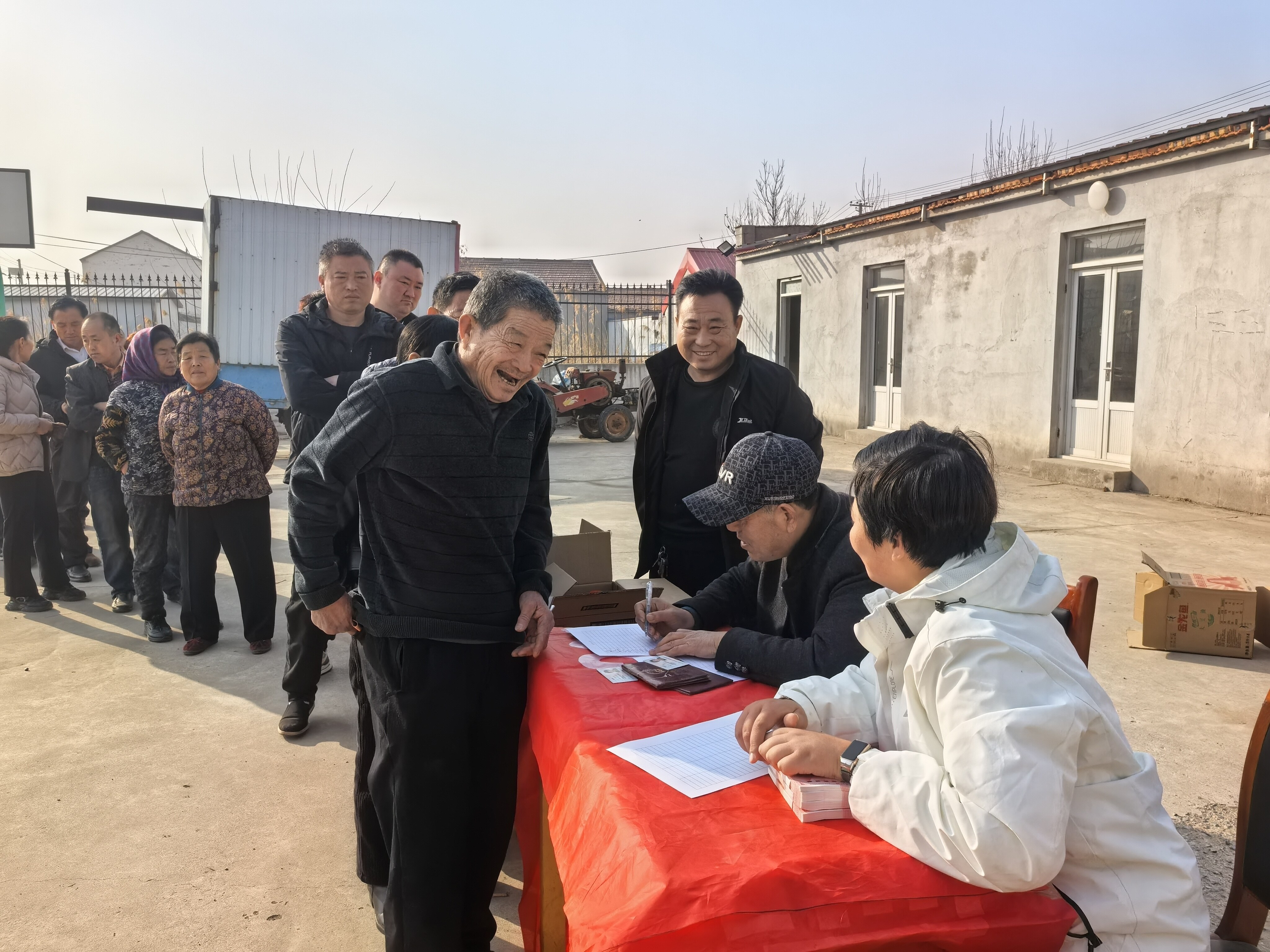 分发现场秩序井然,热闹非凡。村民们骑着三轮车拿着身份证、户口本陆续赶来,车斗还没腾空,笑容已先装得满满当当。村里的工作人员配合默契,一边递上沉甸甸的礼包,一边弯下腰询问老人的腿脚好不好、年货备齐了没有,反复叮嘱天冷添衣、安心过年。“连着十年都记挂着我们,真是太贴心了!”十年前第一批收到年货的八旬老人刘俊英,手里攥着刚领到的500元红包,话音里满是热乎劲儿。