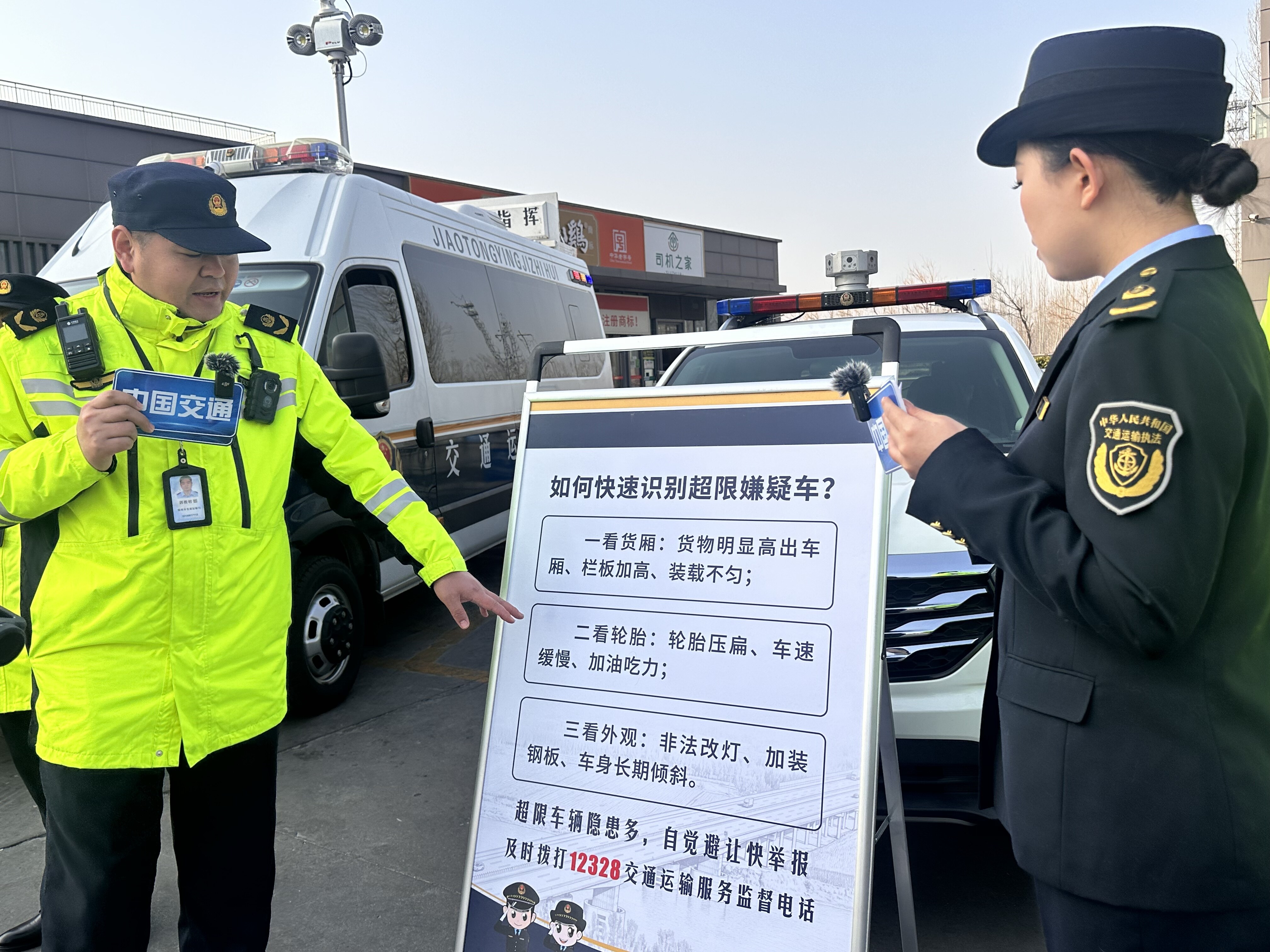 执法人员在直播现场重点对客运班车、旅游包车、危险品运输车开展安全检查,严查货车超载、客车超员等交通违法行为,同时科普车辆安全隐患识别知识,公布12328监督电话,号召群众共同参与平安春运建设。