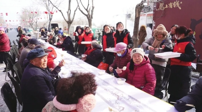 德州晚报全媒体讯 农历小年前后,在武城县四女寺镇“寻味中国年”运河大集上,有一片特殊的孝老爱亲区域,热气氤氲、笑声不断,大铁锅炉火正旺。身穿红马甲的志愿者动作利落地煮饺子、分餐,将一盘盘刚出锅的热饺子,端至长条桌旁的老人们面前。从腊月二十到腊月廿六,四女寺镇连续7天举办敬老饺子宴。每天中午11点到下午1点,全镇70岁以上老人都可以在这里免费吃上一顿热乎乎的饺子,志愿者每天接待服务老人超200人次。