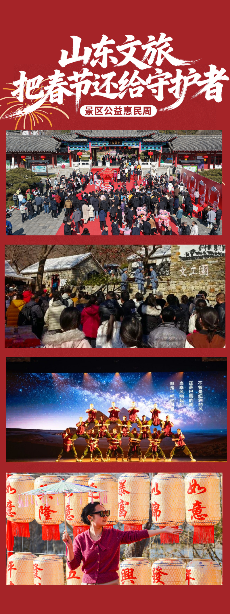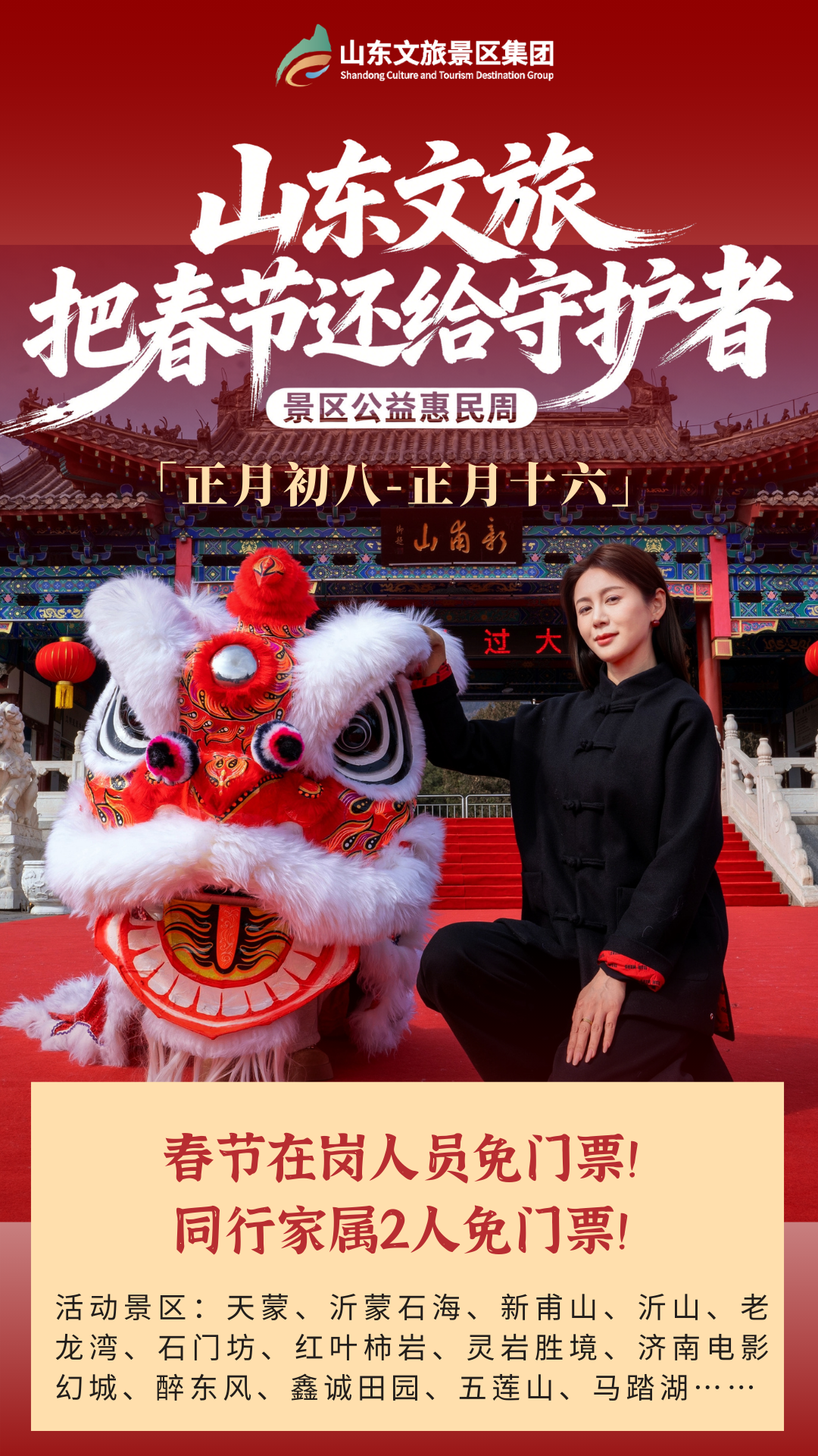为致敬每一位春节在岗的一线工作者,山东文旅景区集团正式启动“把春节还给守护者”公益周活动。2月24日(正月初八)至3月4日(正月十六),集团旗下13家重点景区向全国春节在岗的“守护者”敞开免费大门,邀请他们与家人一同走进山水,补上一场迟来的春日团圆。