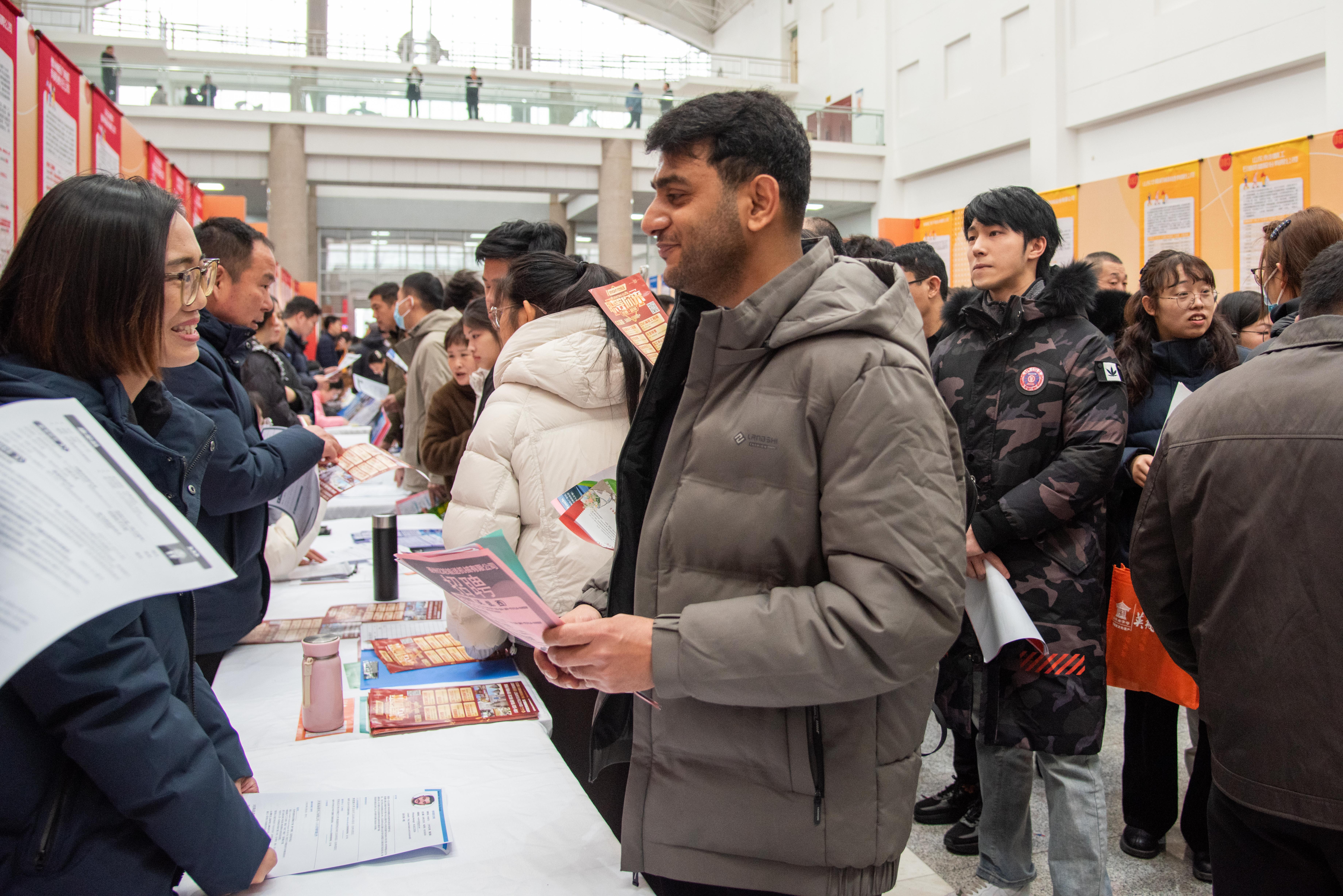 上午9时,会展中心门口已是人头攒动、气氛热烈。求职者们手持简历,穿梭于各企业展位之间,详细了解岗位要求、薪资待遇及职业发展前景。人群里,马来西亚理工大学工商管理专业的硕士毕业生于泽华正在与企业交谈,今年春节回家,听说有大型招聘会,他特意赶过来看看。