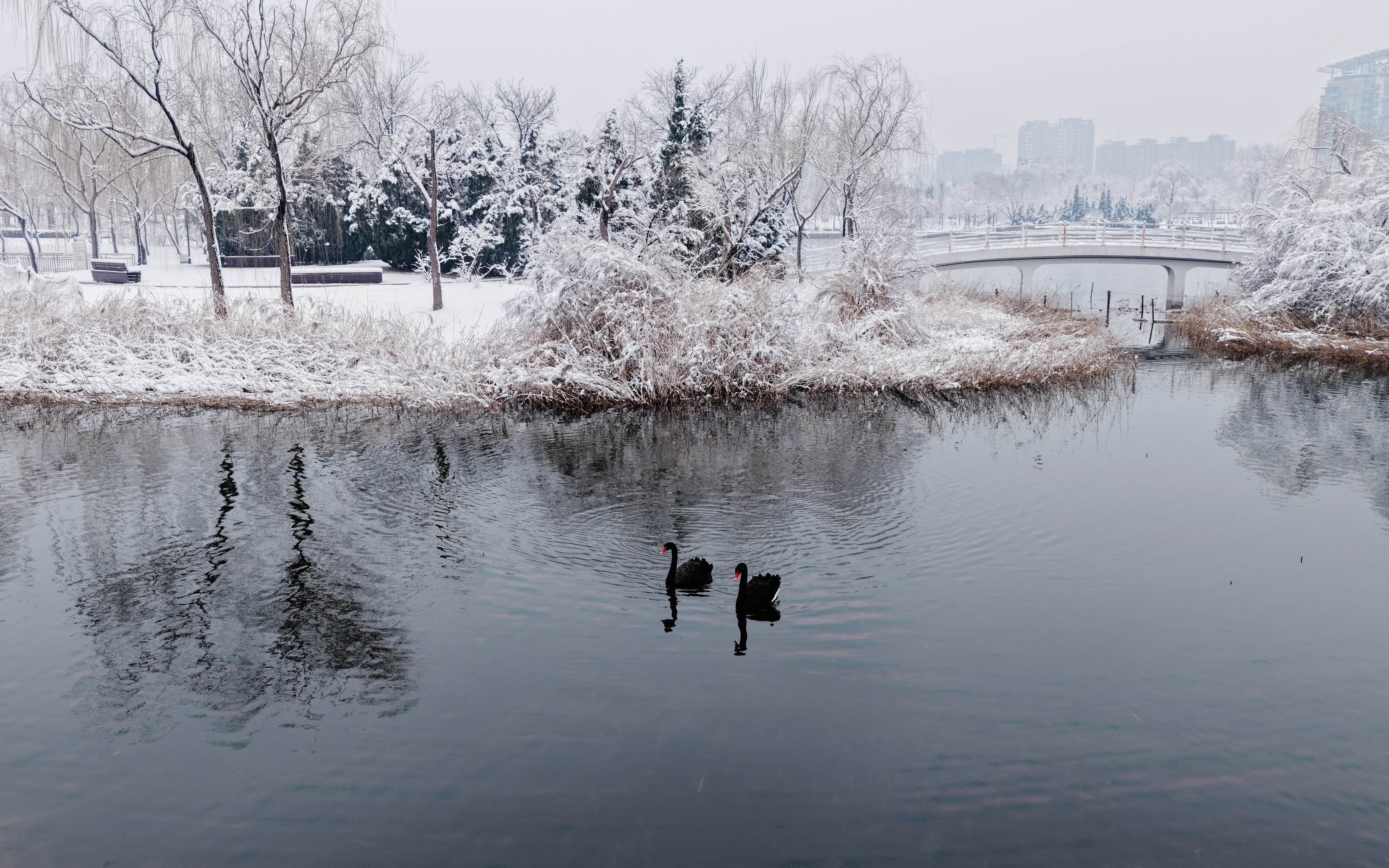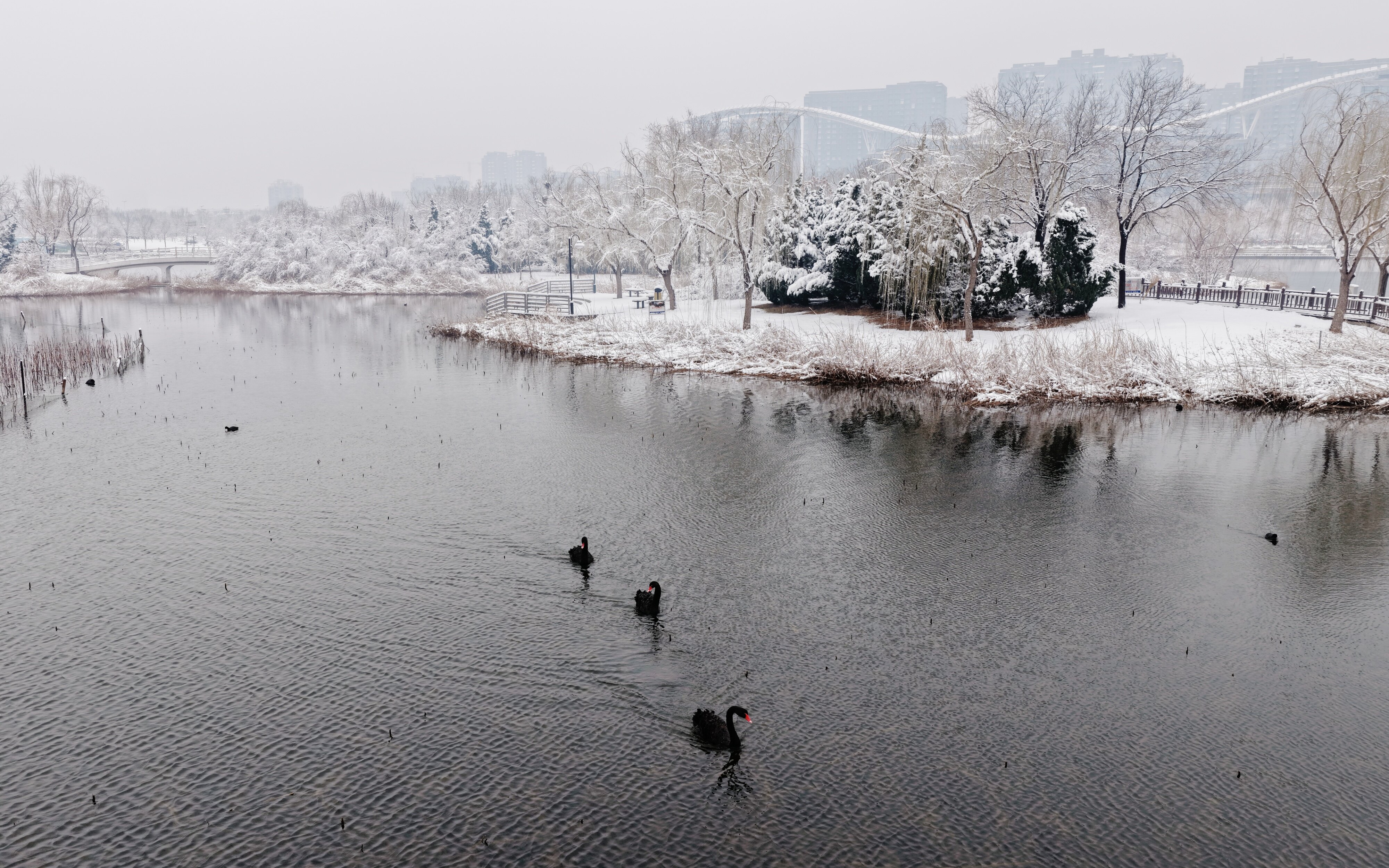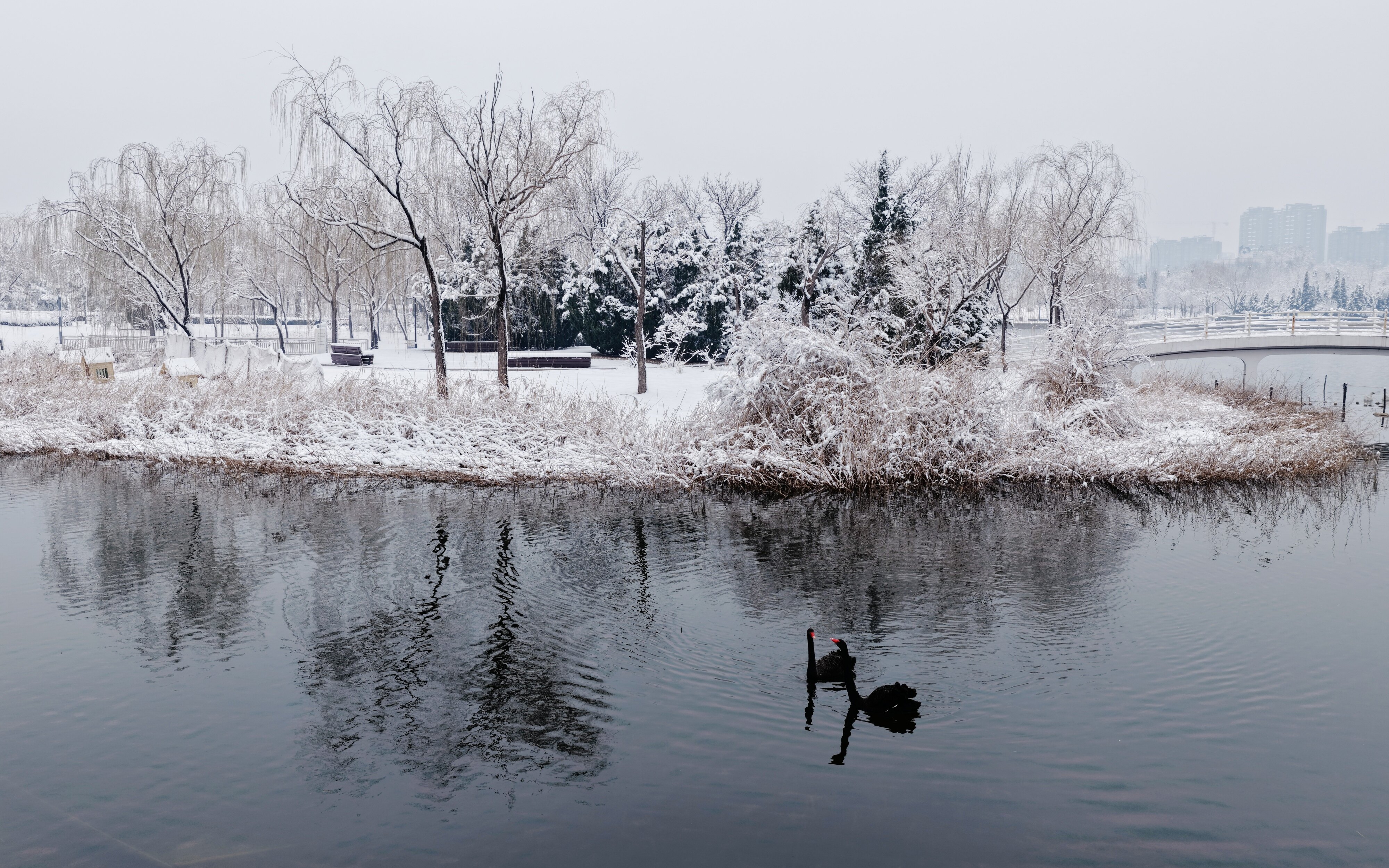 3月2日,雪后的长河公园,银装素裹。黑天鹅在寒波里游过,是这素白世界里最温柔的一抹亮色。