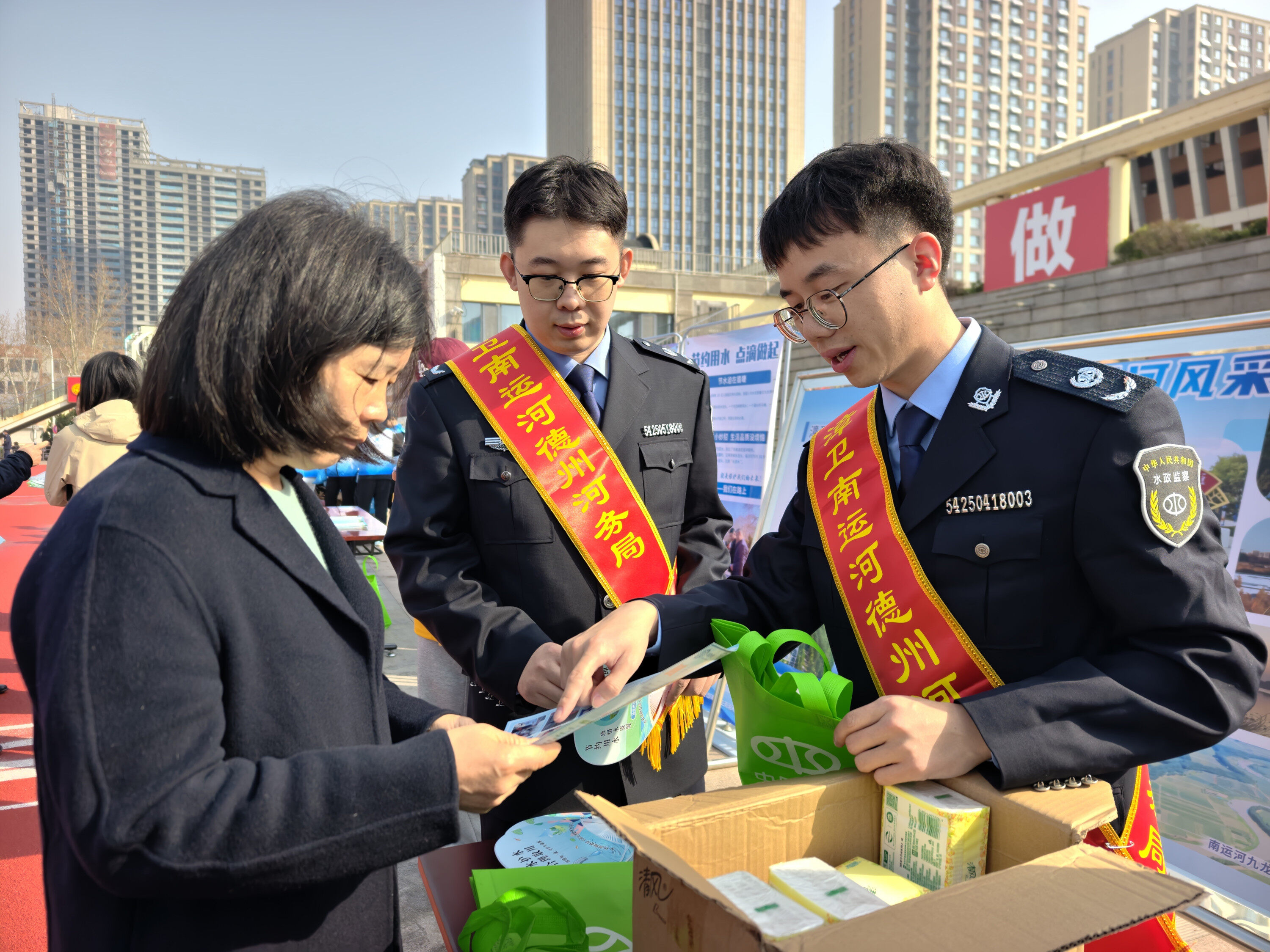 联合国将2026年“世界水日”主题定为“Water and Gender”,译为“水与性别”。水利部确定2026年“中国水周”主题为“国家水网 世纪画卷”。活动现场,各参与单位沿中心广场区域依次设立宣传展台。展台上,工作人员向过往市民发放节水知识手册、法律法规读本以及定制节水宣传手袋等纪念品。20余块宣传展板有序排列,内容涵盖水资源管理、河湖保护、水利工程建设成果等,吸引众多市民驻足观看。部分展台还安排了专人讲解,耐心解答群众关于家庭节水、供水安全等方面的疑问。