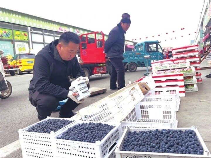 3月24日,德州黑马智慧冷链果品批发市场内车来车往,顺达果业店长屈言岭正忙着给顾客打包蓝莓。