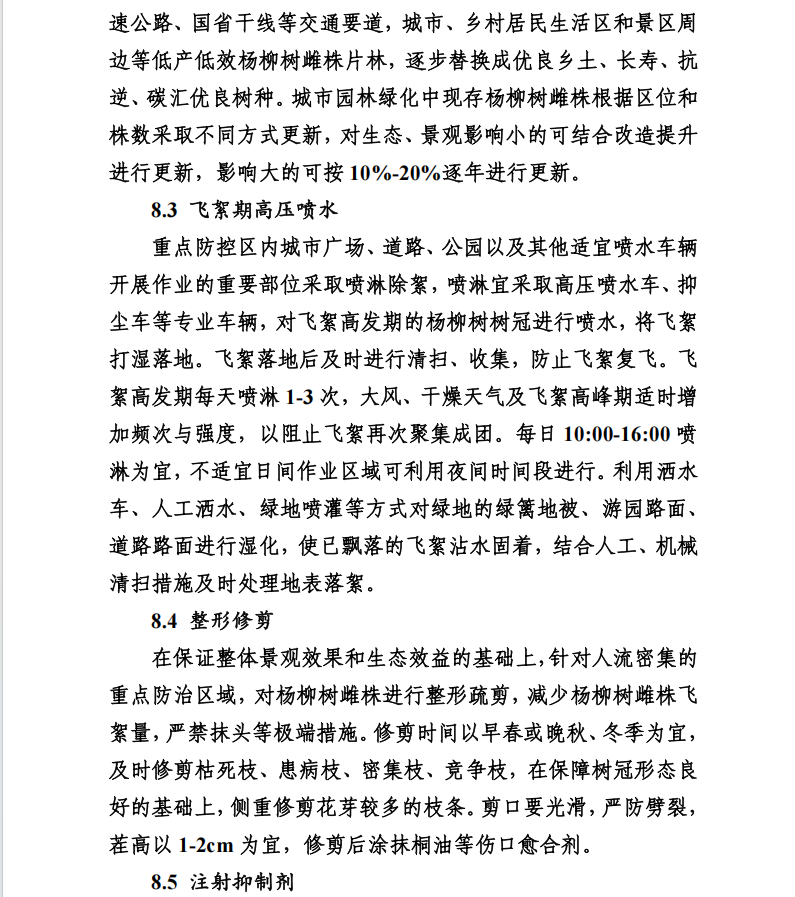 在治理措施上,方案提出严把“四大关口”:严把监测预报关。完善飞絮监测网络体系,做好杨柳飞絮预测预报。严把时效关。在果序集中开裂时段,通过高压喷淋树冠压减飞絮量,并在早、晚高峰前及夜间加强路面湿化和清扫作业。严把区域关。针对医院、学校、养老院、大型商业区及人员密集居住区等重点治理区域,采取注射飞絮抑制剂、高频喷淋与人工清扫相结合的组合措施;对行道树和片林区域,使用高压喷水车喷淋树冠并配合机械清扫;大型车辆无法进入的区域,采用小型清扫湿化设备进行施治。严把技术关。规范开展抑制剂注射、整形修剪等工作,提升治理的专业性和有效性。